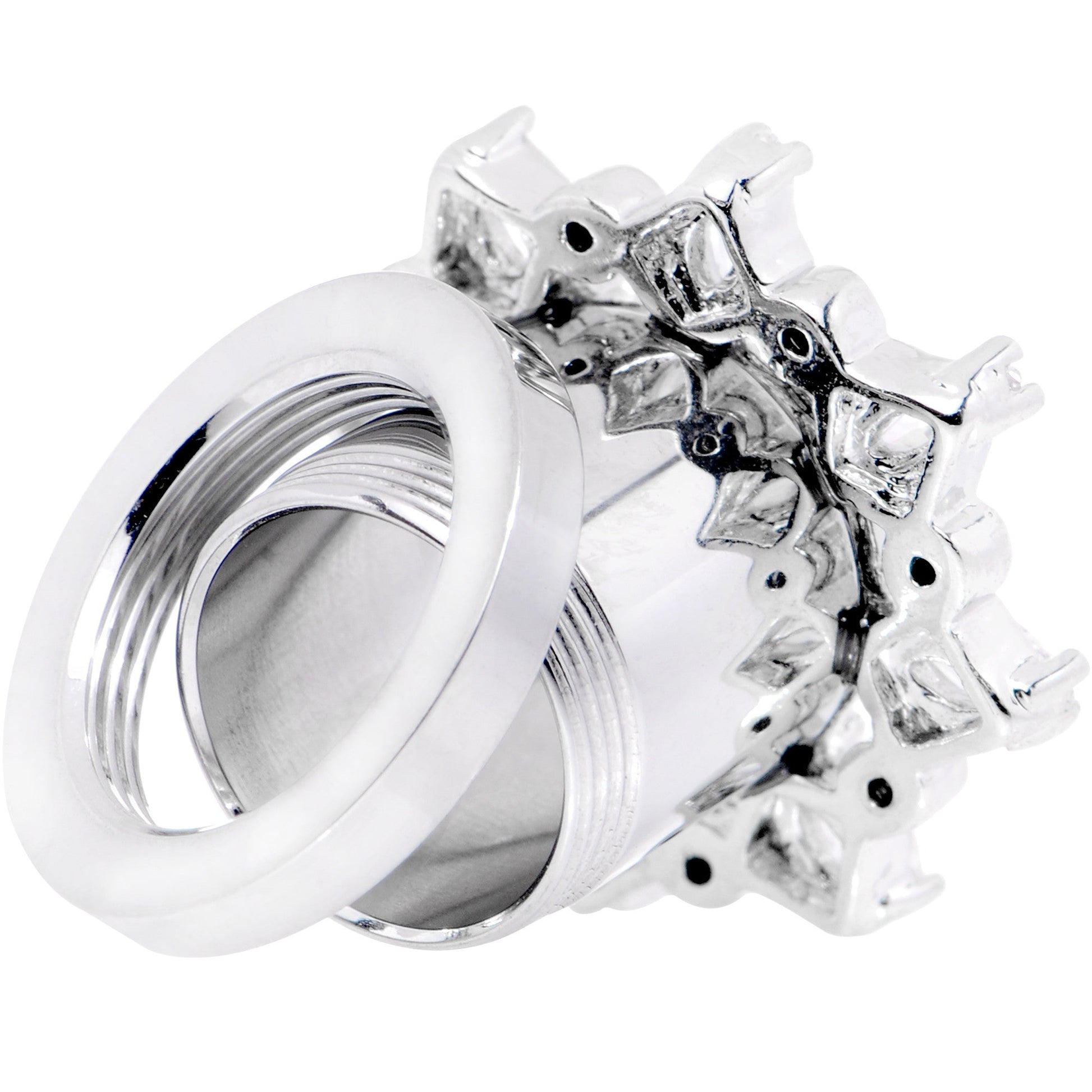 Add a little decadent flair to your stretched lobes whenever you wear this pair of pretty double flare plugs. Made with durable 316L surgical grade stainless steel, these 10mm ear gauges feature a front flare set with clear gems to catch the eye of your beholder. This pair of plugs is made with a screw fit design for easier insertion and removal and is sold as a set of two.