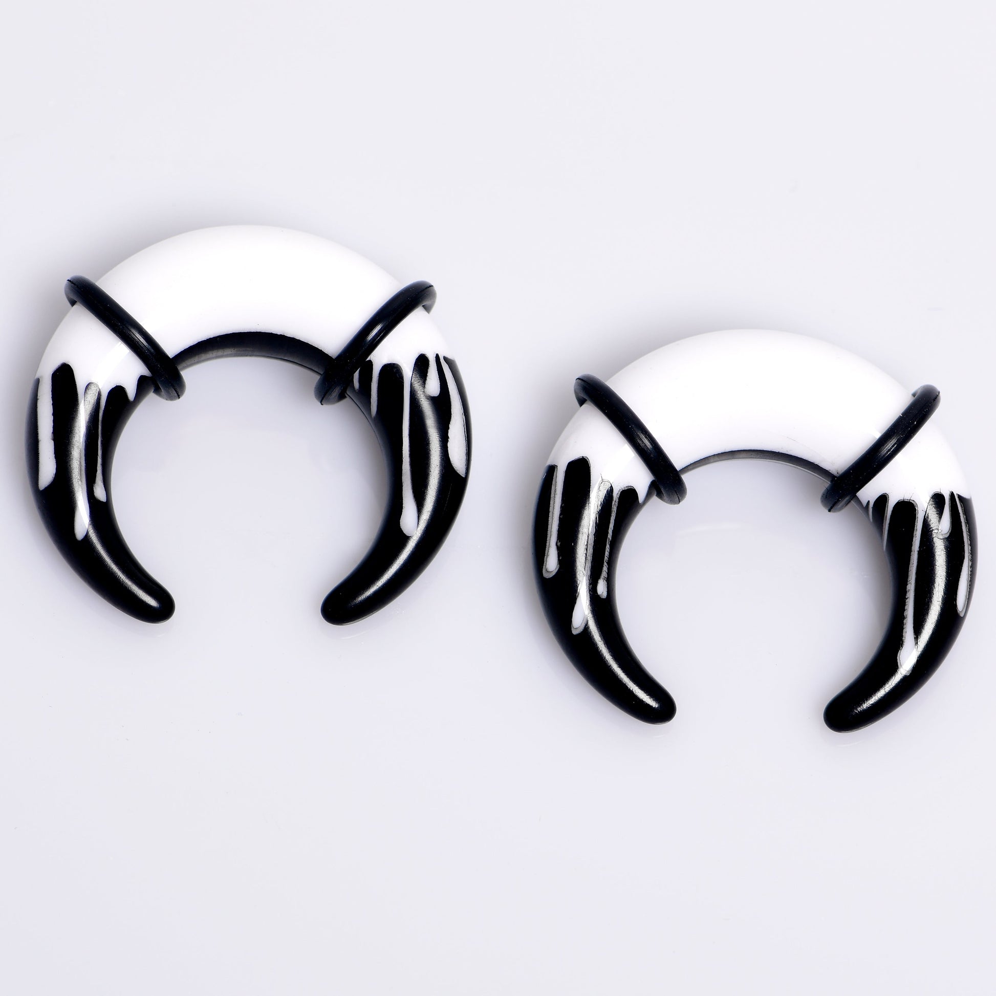 Hypoallergenic jewelry for sensitive skin.0 Gauge Black White Reverse Drip Acrylic Pincher Curved Taper Set