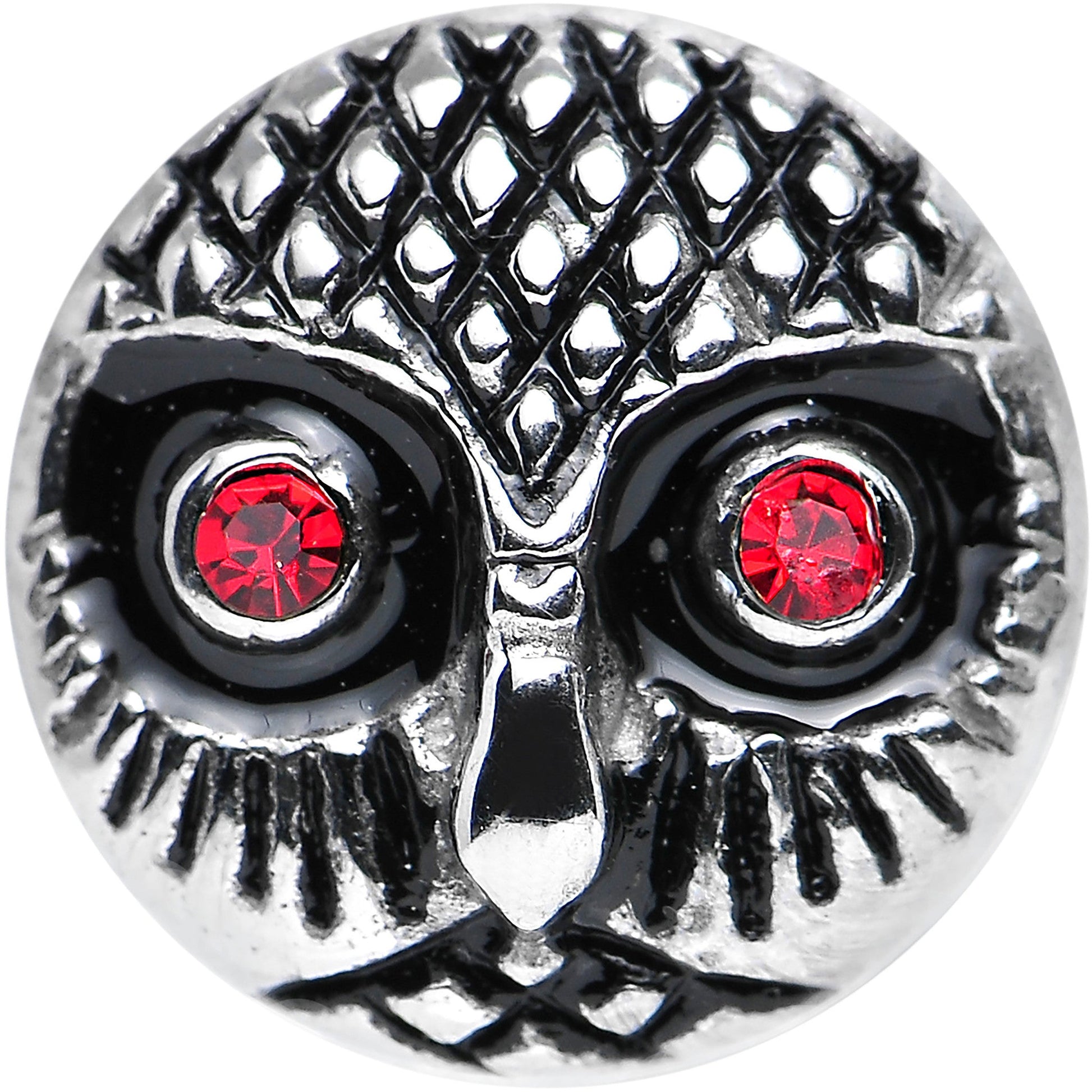Hypoallergenic jewelry for sensitive skinItem sold individually, purchase two for a pair. Show off the wisdom of ages with this feathered owl face stainless steel ear stretcher screw fit plug featuring sparkling red gem eyes. The fellow on the vintage looking 8mm ear expander may look deep in thought, but he has shine in abundance. Bird pierced body jewelry ear stretcher ear gauge plug.