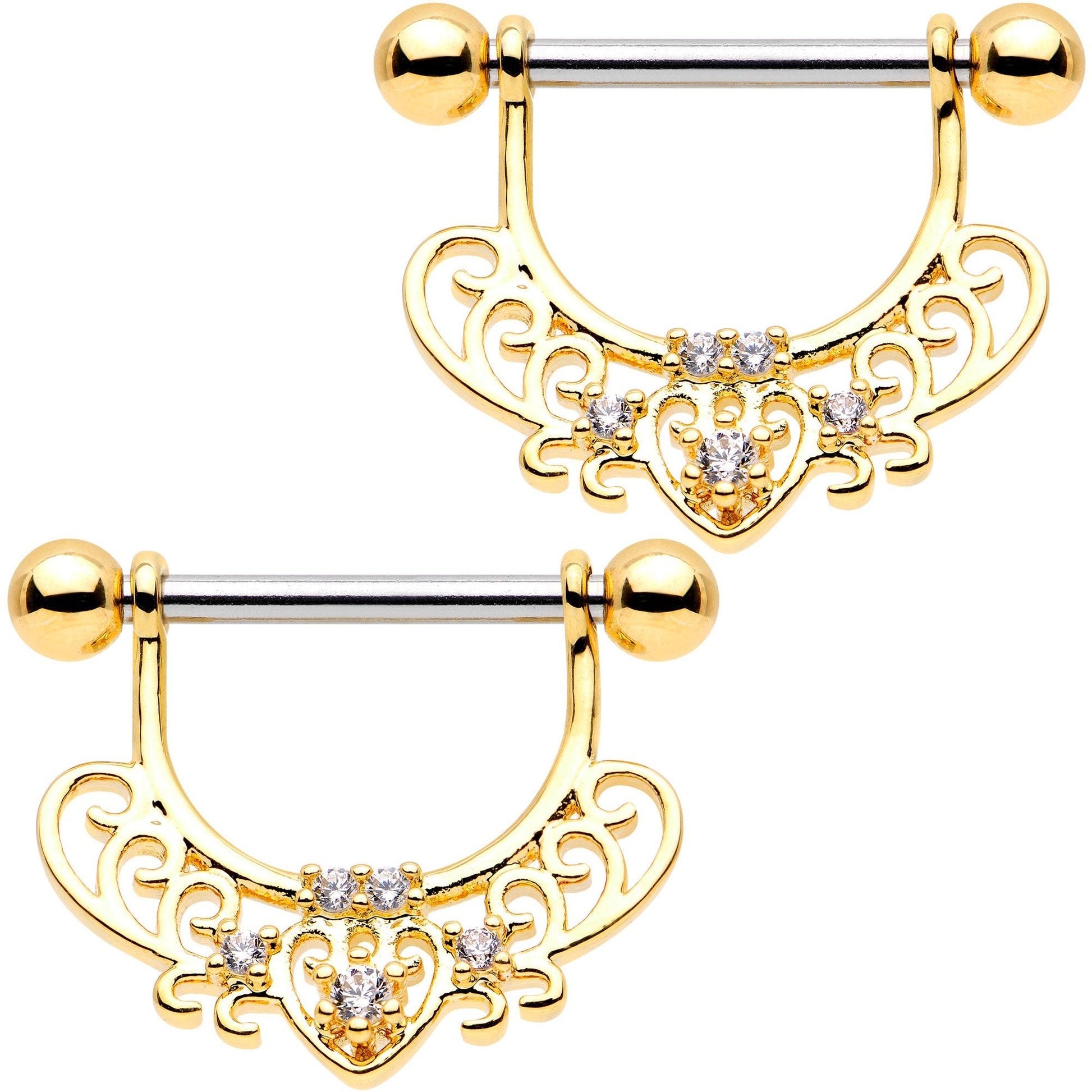 If you've been in search of an eye-catching style for your nipple piercing, then have we got just the thing for you! This 14 gauge nipple clicker set features an eastern aesthetic, with a swirling gold tone mehndi design decorated by a cluster of brilliant clear cubic zirconia gems. The 12mm length straight hinged barbell is made from durable 316L surgical grade stainless steel. Sold as a set of two for you!