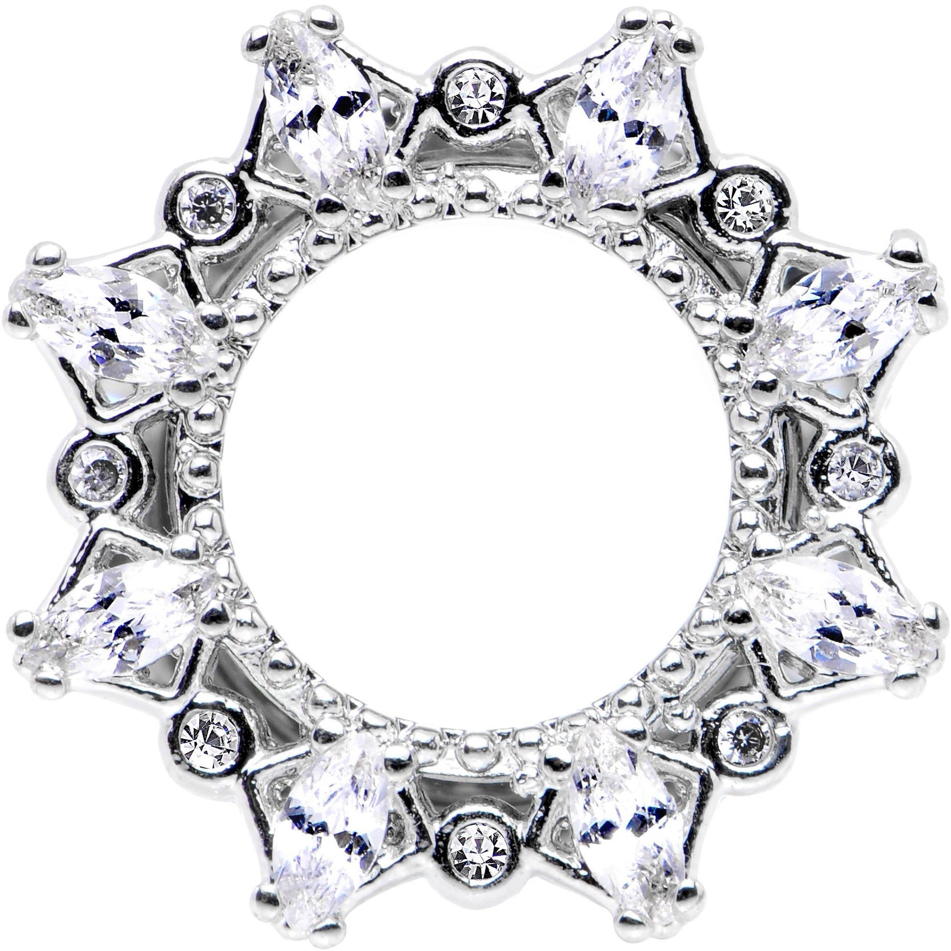 Add a little decadent flair to your stretched lobes whenever you wear this pair of pretty double flare plugs. Made with durable 316L surgical grade stainless steel, these 12mm ear gauges feature a front flare set with clear gems to catch the eye of your beholder. This pair of plugs is made with a screw fit design for easier insertion and removal and is sold as a set of two.