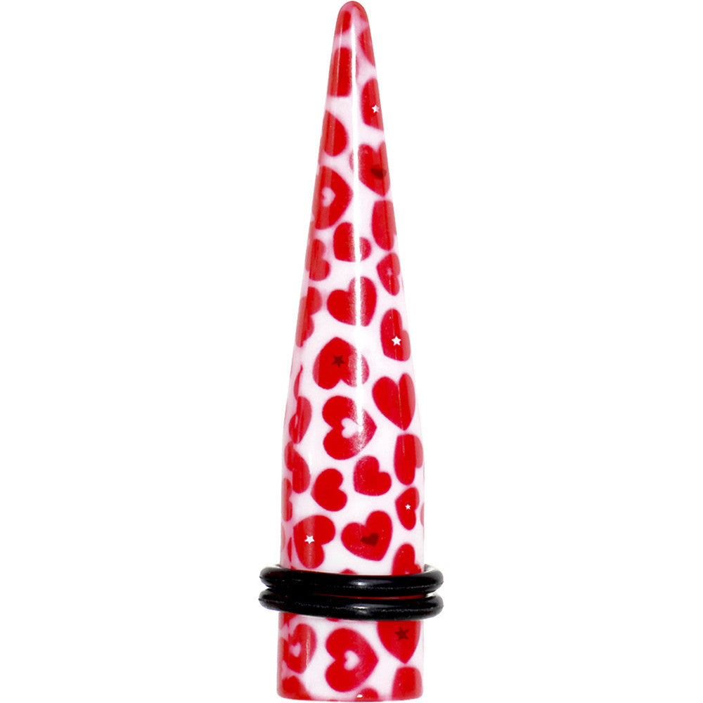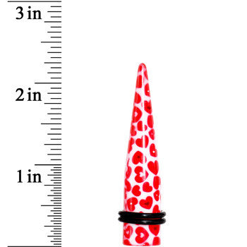 Hypoallergenic jewelry for sensitive skin.12mm ear taper. This white acrylic ear plug features multiple red hearts. Heart ear expender featuring two rubber O-rings. Body piercing ear taper sold individually.