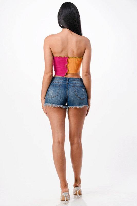 Asymmetric Contrast lettuce edge knit crop top. For the color name, first color is the longer/left side of the top.
