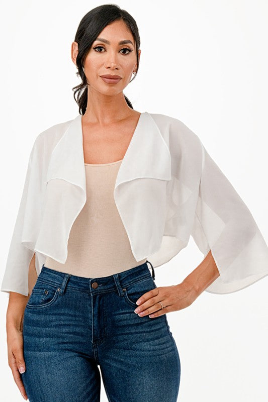 Sheer Chiffon Bolero with cascading front opening and wide elbow length sleeves with slit