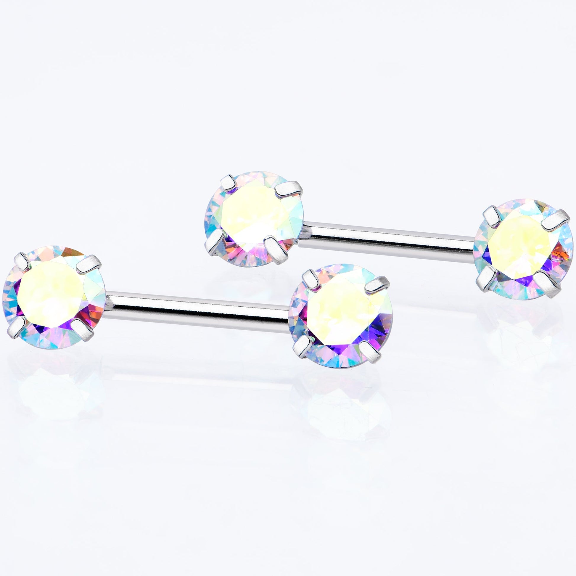 Add some sexy sophistication to your nipple piercings with this 14 gauge nipple jewelry! It's made with 12mm durable 316L surgical grade stainless steel straight barbells. The charm ends are threadless round aurora color cubic zirconia gems made to make insertion and removal a breeze while still offering a secure fit. With their easy elegance and uncomplicated sophistication, these nipple piercing rings really do have it all! Sold as a set of two.Specifications