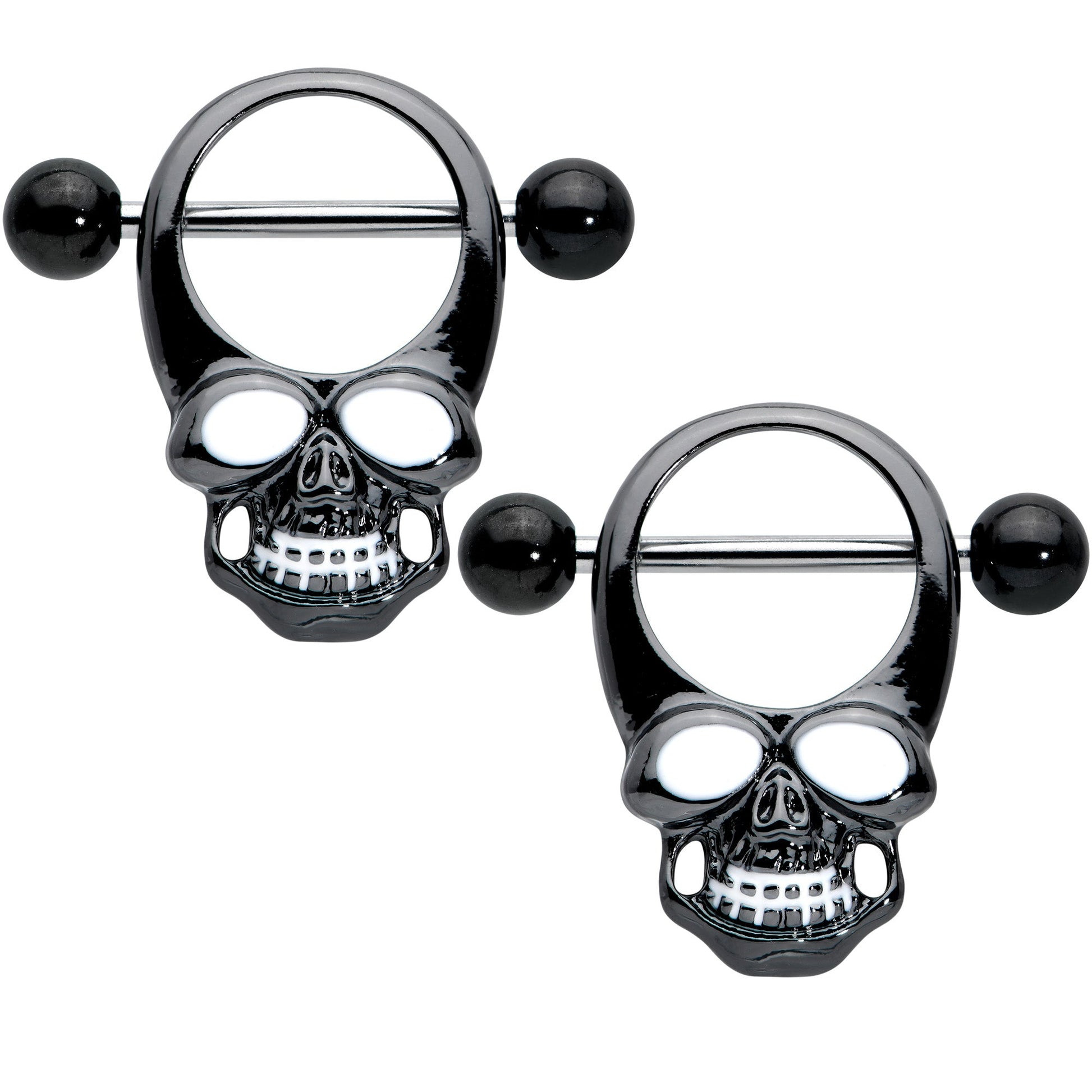 If you're into all things creepy, this 14 gauge nipple jewelry will be sure to have you smiling! It's made with 12mm wearable length 316L surgical grade stainless steel straight barbell with 5mm black ball ends. The shield portions feature black skulls, wearing rather unsettling grins. The skulls feature white embellishment to make every detail stand out. You'll definitely stand out too if you're rocking these spooky, smiling skull nipple piercing shields! Sold as a set of two.Specifications