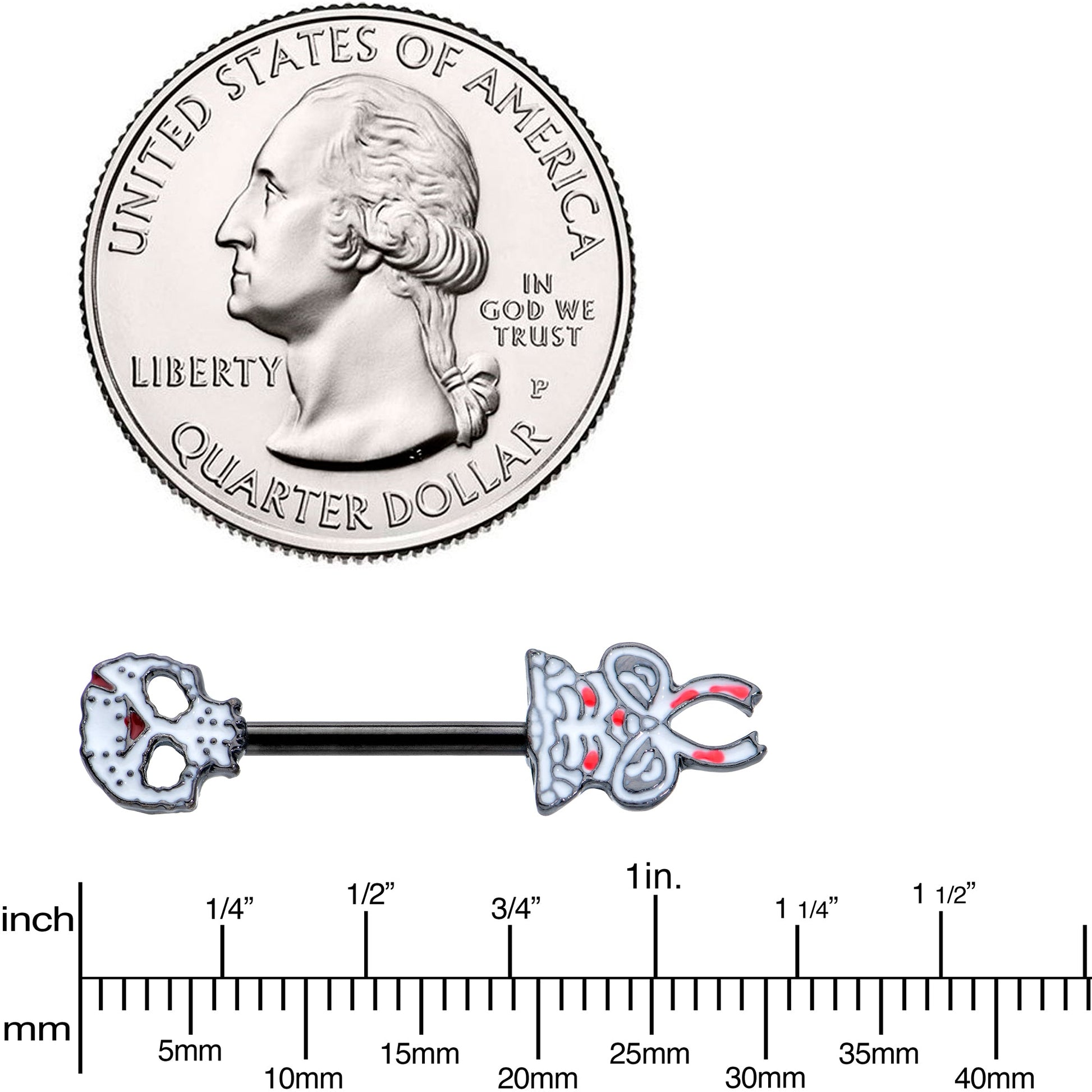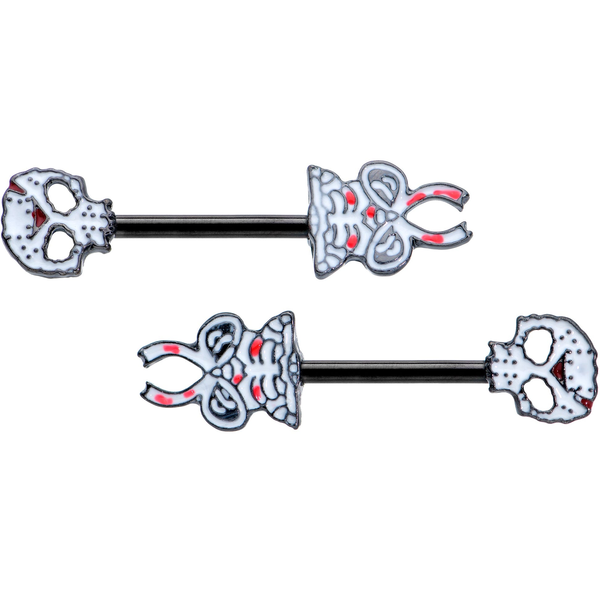 This Halloween, let these skeletons' bodies beautify your own with this 14 gauge nipple jewelry. It's made with 12mm black plated over 316L surgical grade stainless steel straight barbells. One end features a skeleton's head charm, with contrasting detail to really make it pop. The other end features a skeleton's hips and pelvis charm with matching detailing and pink embellishment. Have the best bodies around this Halloween, with this sleek and elegant skeleton nipple piercing jewelry! Sold as a set of two.Specifications