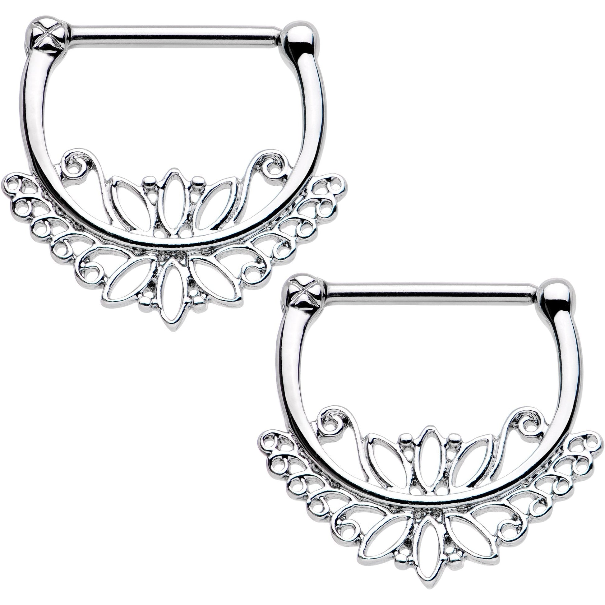 Dress up your breasts with this pair of perfectly lovely flower-inspired 14 gauge nipple rings. Made with 12mm durable 316L surgical grade stainless steel hinged straight barbells, this pair of nipple piercings features a 15mm width and 10mm rise as well as a lotus style series of leaves inside and along the bottom rim. Sold as a set of two for you!