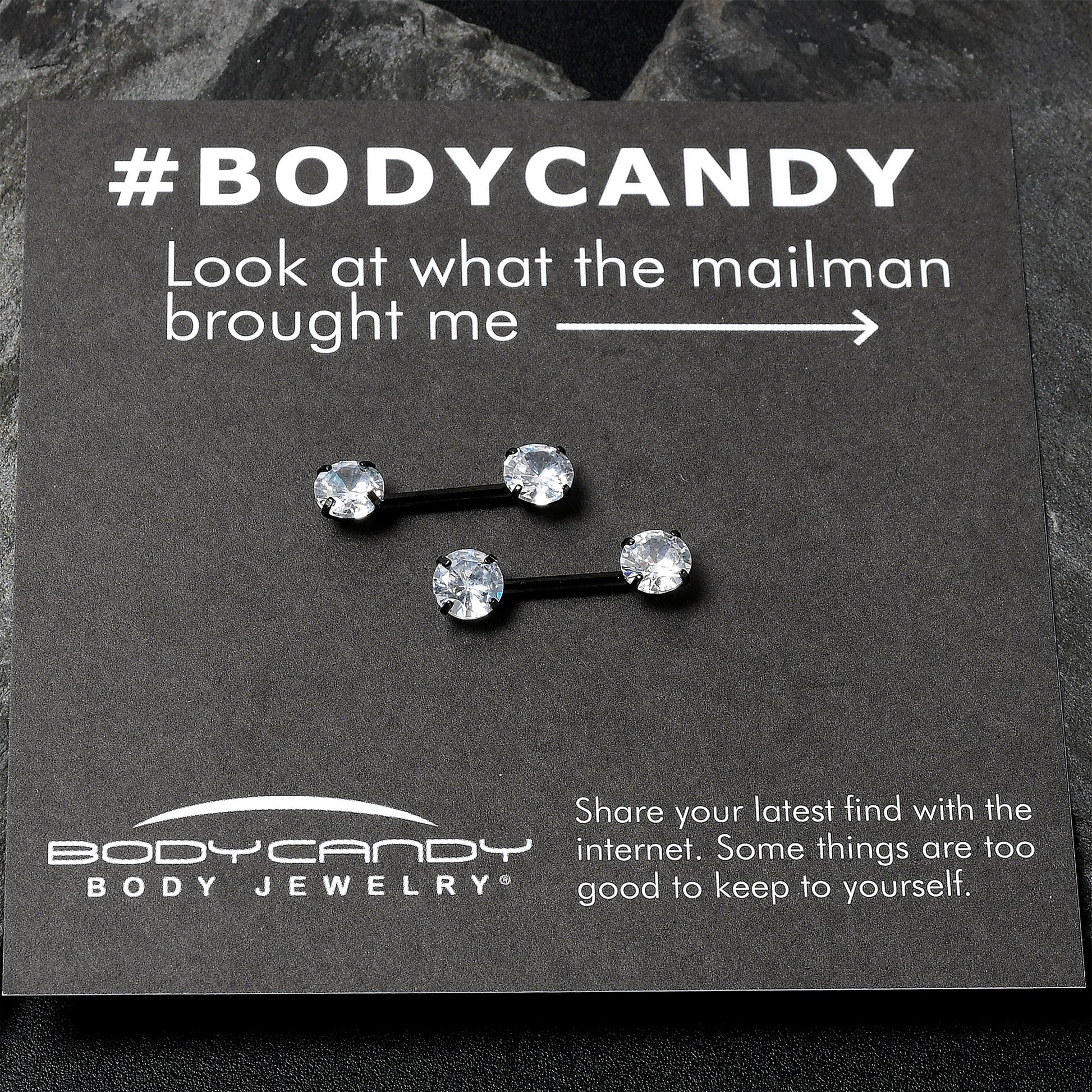 Add some sexy sophistication to your nipple piercings with this 14 gauge nipple jewelry! It's made with 12mm black PVD over 316L surgical grade stainless steel straight barbells. The charm ends are threadless round clear cubic zirconia gems made to make insertion and removal a breeze while still offering a secure fit. With their easy elegance and uncomplicated sophistication, these nipple piercing rings really do have it all! Sold as a set of two.Specifications