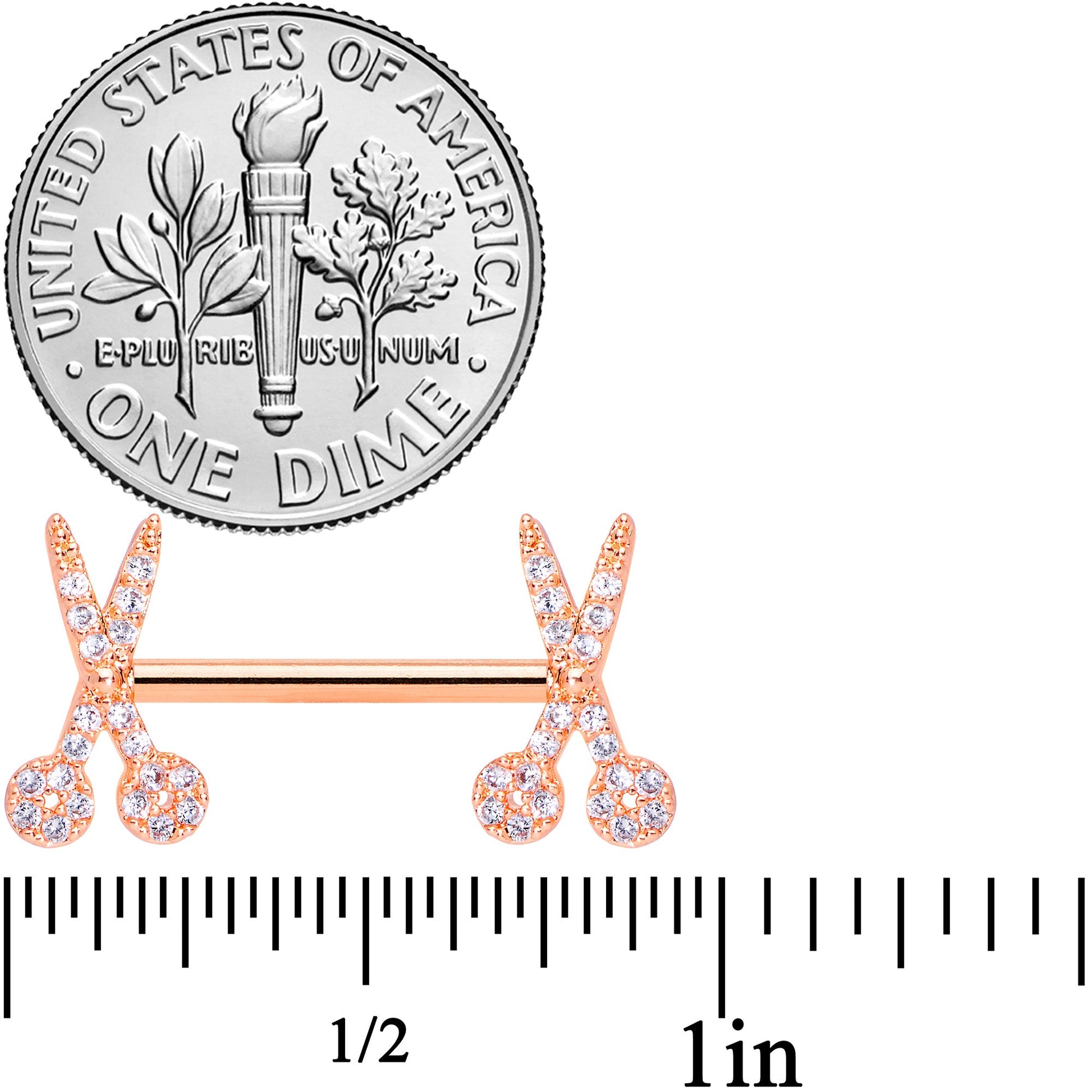 Whether you call them scissors or shears, you'll be calling them gorgeous on this 14 gauge nipple jewelry! It's made with 12mm rose gold tone PVD over 316L surgical grade stainless steel straight barbells. The ends each feature an open pair of scissors charm paved with clear cubic zirconia gems for a look that screams elegance. Add a great big snip of glamour to your nipple piercings with these stunning scissor nipple rings! Sold as a set of two.Specifications
