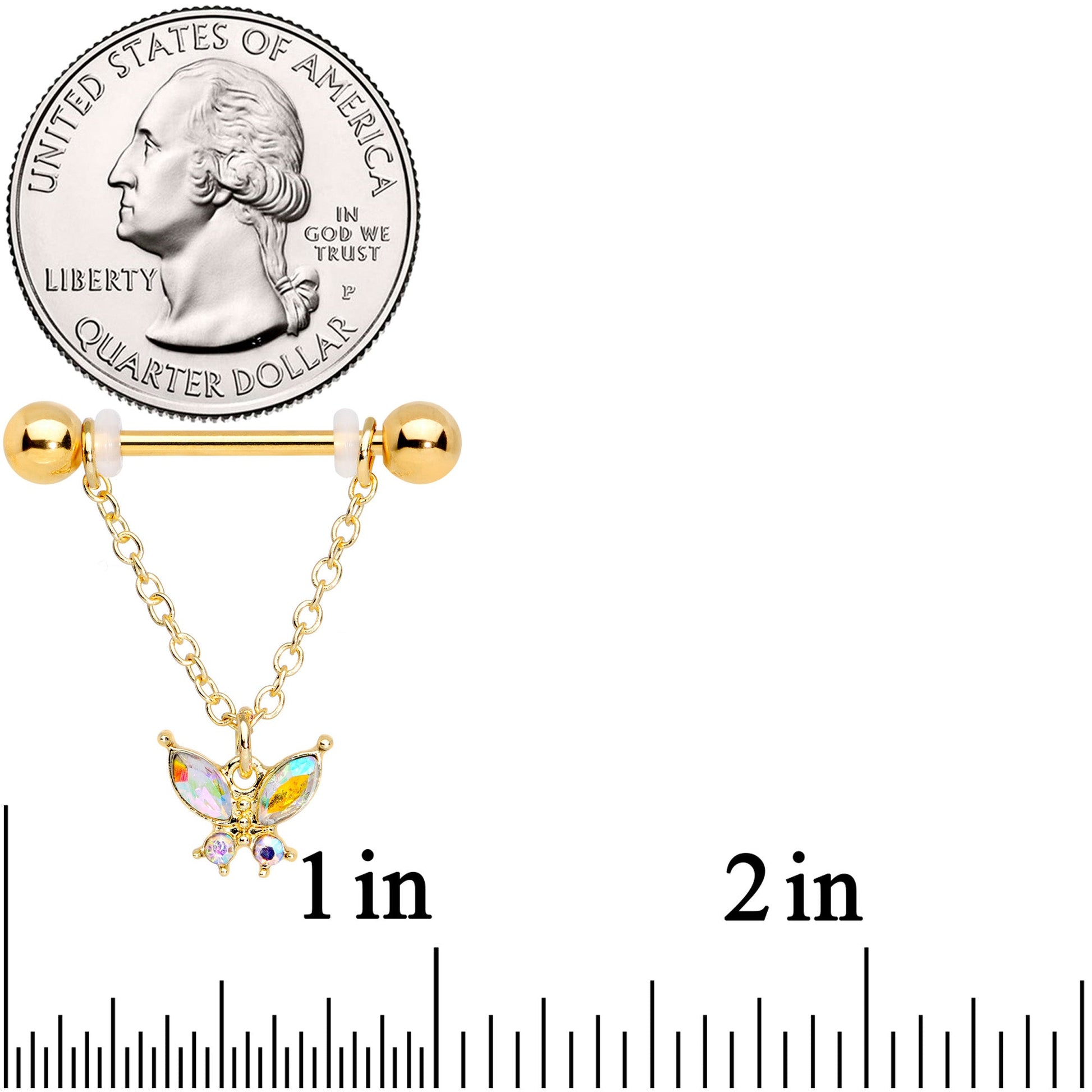 Bedeck your piercing with the beautiful butterflies on these 14 gauge nipple piercing rings! They're made with 18mm gold tone plated over 316L surgical grade stainless steel straight barbells with 5mm ball ends. Dangling from a length of matching chain are dainty butterfly charms made with four aurora color gems. Best of all, you can adjust the chain up and down the length of the barbells to get just the look you're after. Let these bodacious butterflies pack a powerful punch of polish to your piercings! Sold as a set of twoSpecifications