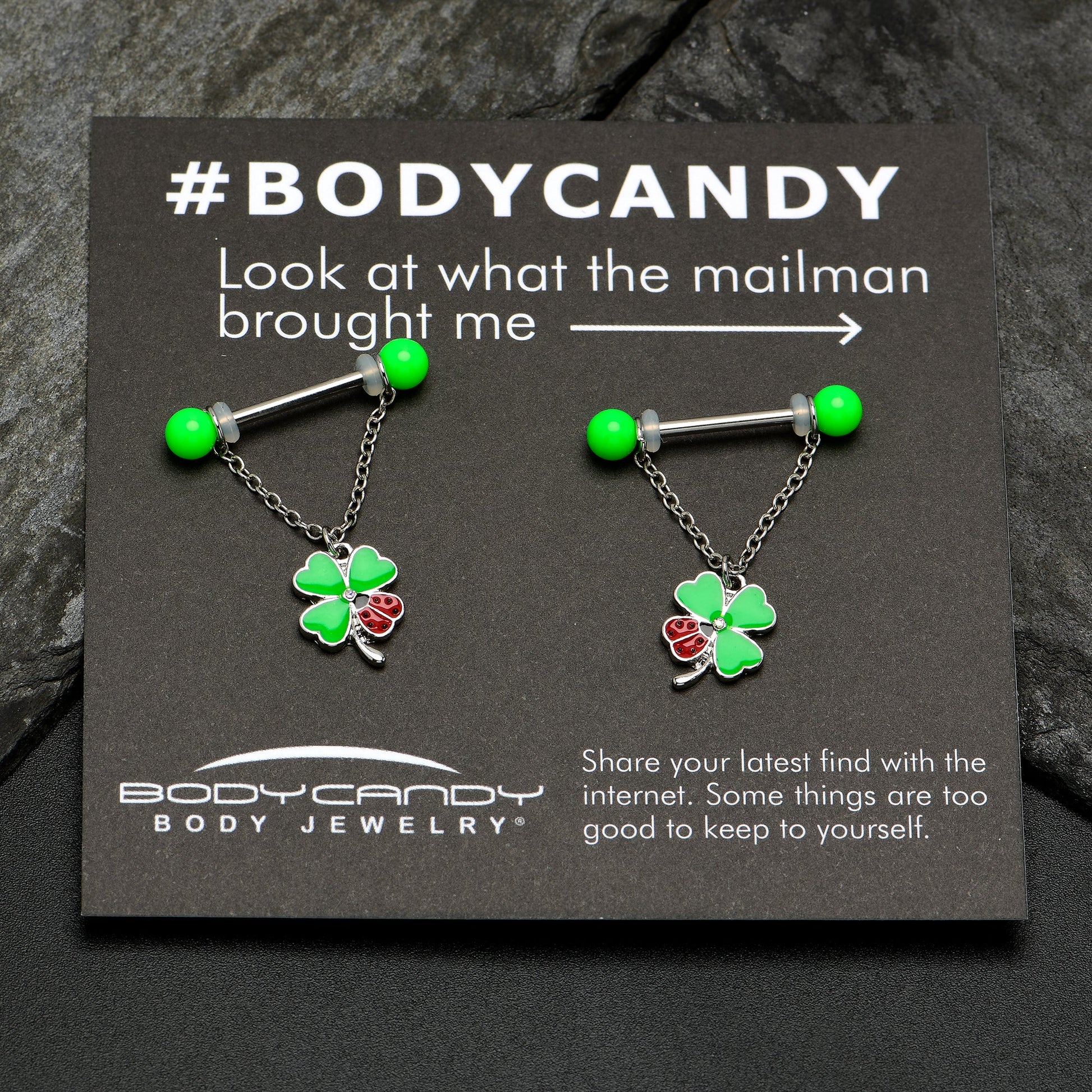 Luck can be a ladybug when you're rocking this 14 gauge nipple jewelry! It's made with 18mm durable 316L surgical grade stainless steel straight barbells with green 5mm ball ends that glow under UV light. Each one features a dangling length of chain that supports a shamrock charm with three green leaves. The fourth leaves are ladybugs, with red inlaid wings and simple embellishments. You'll never want to leaf these Saint Patrick's Day themed nipple piercing rings! Sold as a set of two.Specifications