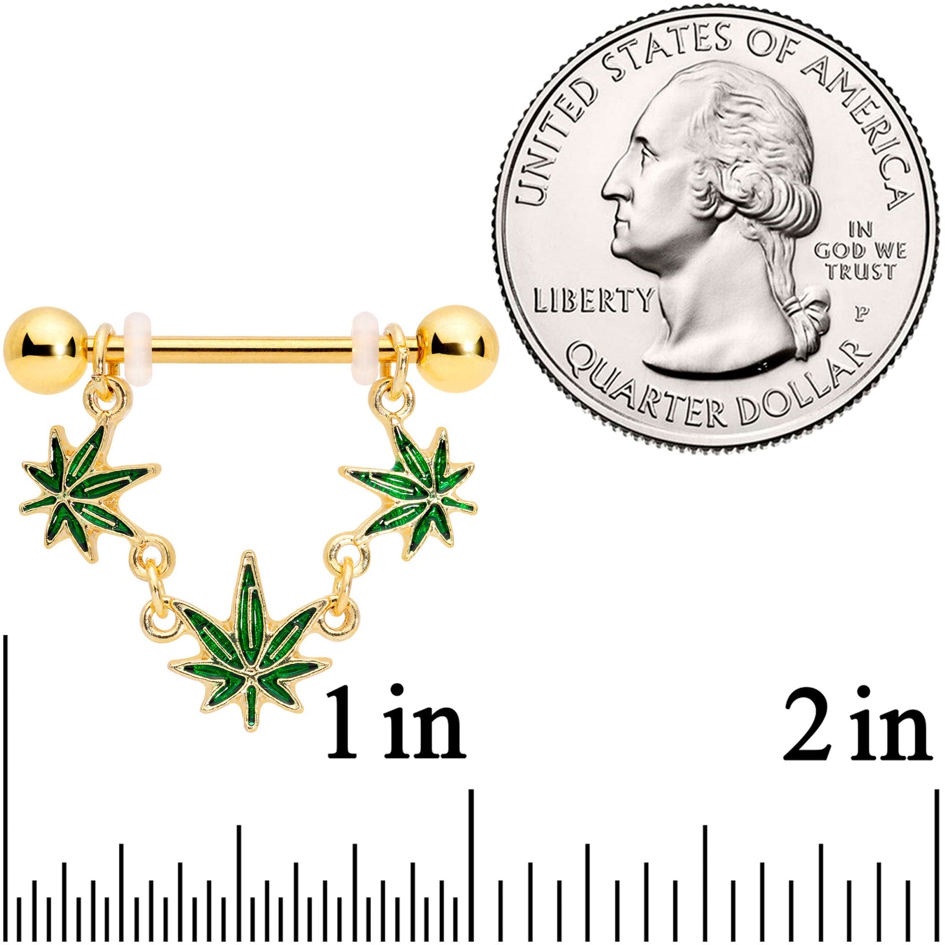 Who needs a watch? It's always 420 when you have this weed-themed 14 gauge nipple jewelry! It's made with 19mm gold tone PVD plated over 316L surgical grade stainless steel straight barbells with 5mm ball ends. Dangling from each is a garland composed of three marijuana leaves. Each one is inlaid in green with gold tone detailing for a realistic appearance as well as a truly lovely color contrast. Make your buds jealous with these ganja garlands in your nipple piercings! Sold as a set of two.Specifications