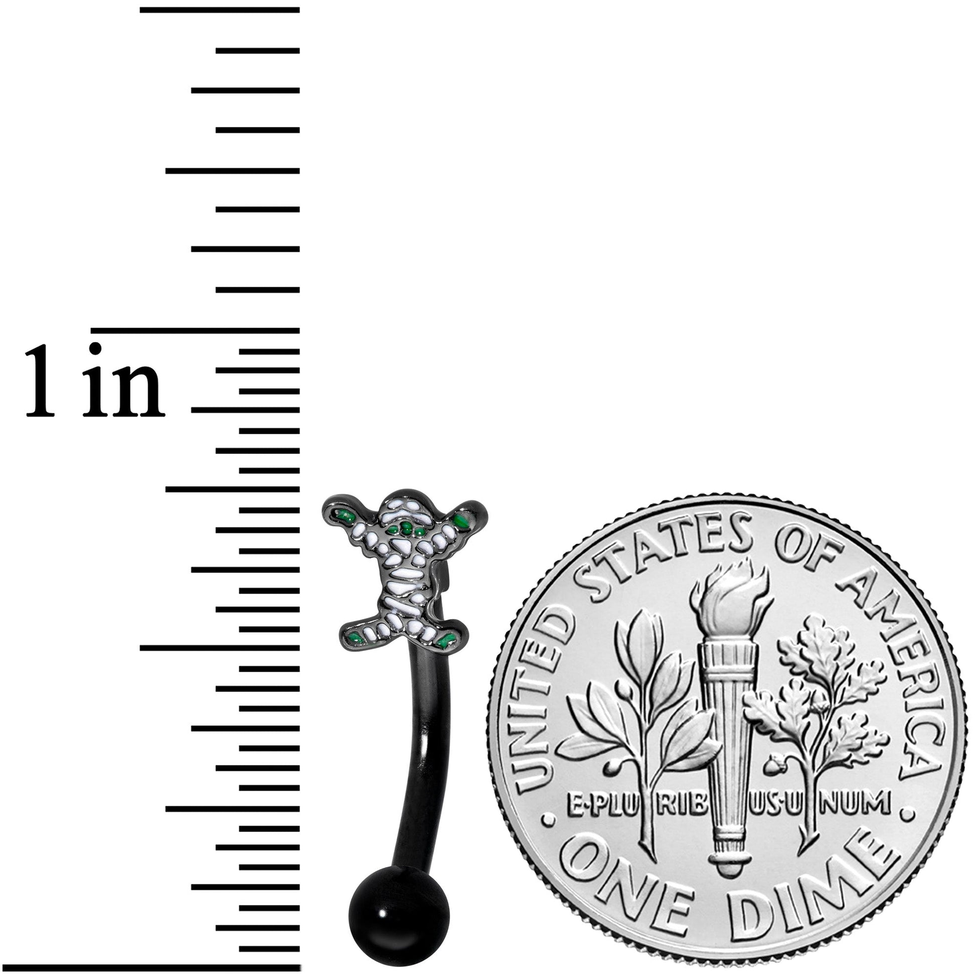 The mummy on this 14 gauge cartilage jewelry will have your piercing looking perfect for Halloween! It's made with an 8mm black PVD over 316L surgical grade stainless steel curved barbell with a 4mm ball end. The other end features a mummy charm with gruesome green skin and white wrappings, arms spread as though it's ready to grab someone and matching black detailing for a cohesive look! With such creepy detailing, this mummy will have your eyebrow piercing looking petrifying!Specifications