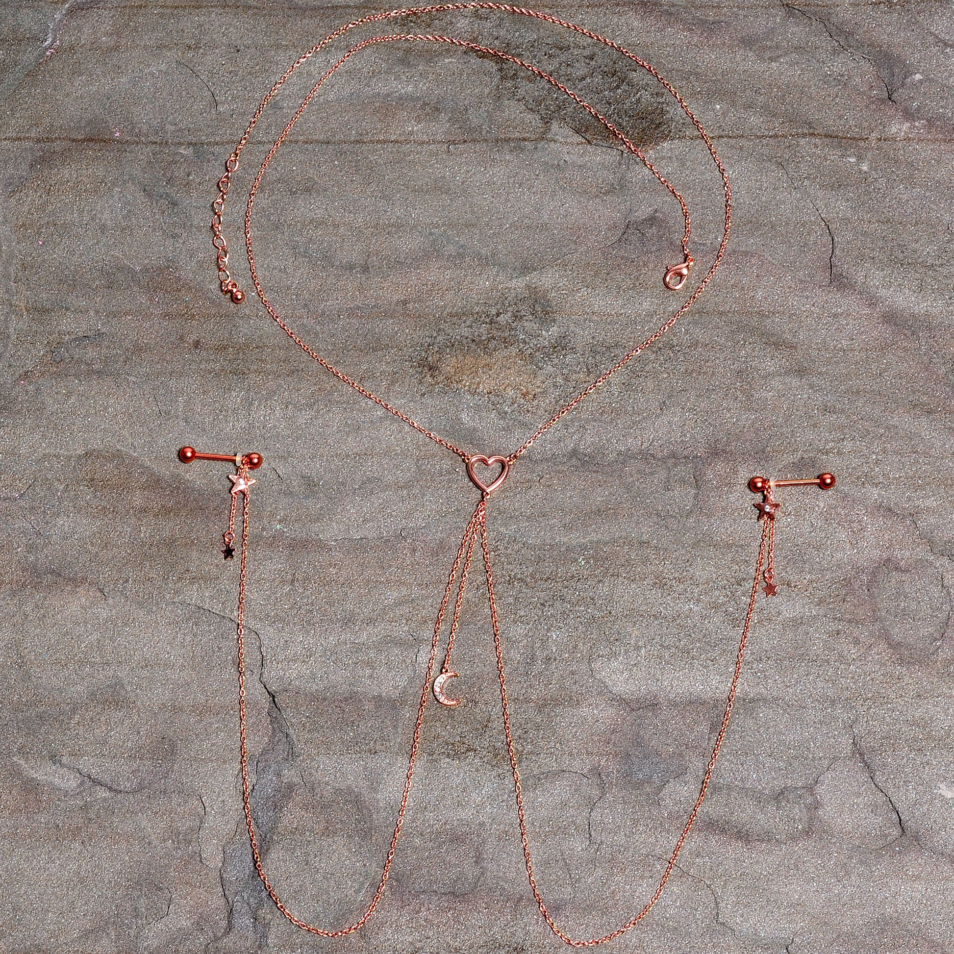 You're going to love this necklace to nipple chain to the stars and back! It features a 26" total length rose gold tone necklace that has a heart charm at the center. The heart has three lengths of matching chain dangling from it. The center one supports a gorgeous crescent moon charm set with aurora gems. The other two chains are 11.5" (with some room for adjustment) and connect to the 16mm rose gold tone plated over 316L surgical grade stainless steel straight barbells with 5mm ball ends. Dangling from the barbells are rose gold tone star charms with a single aurora gem and tiny unadorned rose gold tone star charms than dangle from a matching length of chain. With this stunning necklace nipple chain, your nipple piercings are sure to be starsSpecifications