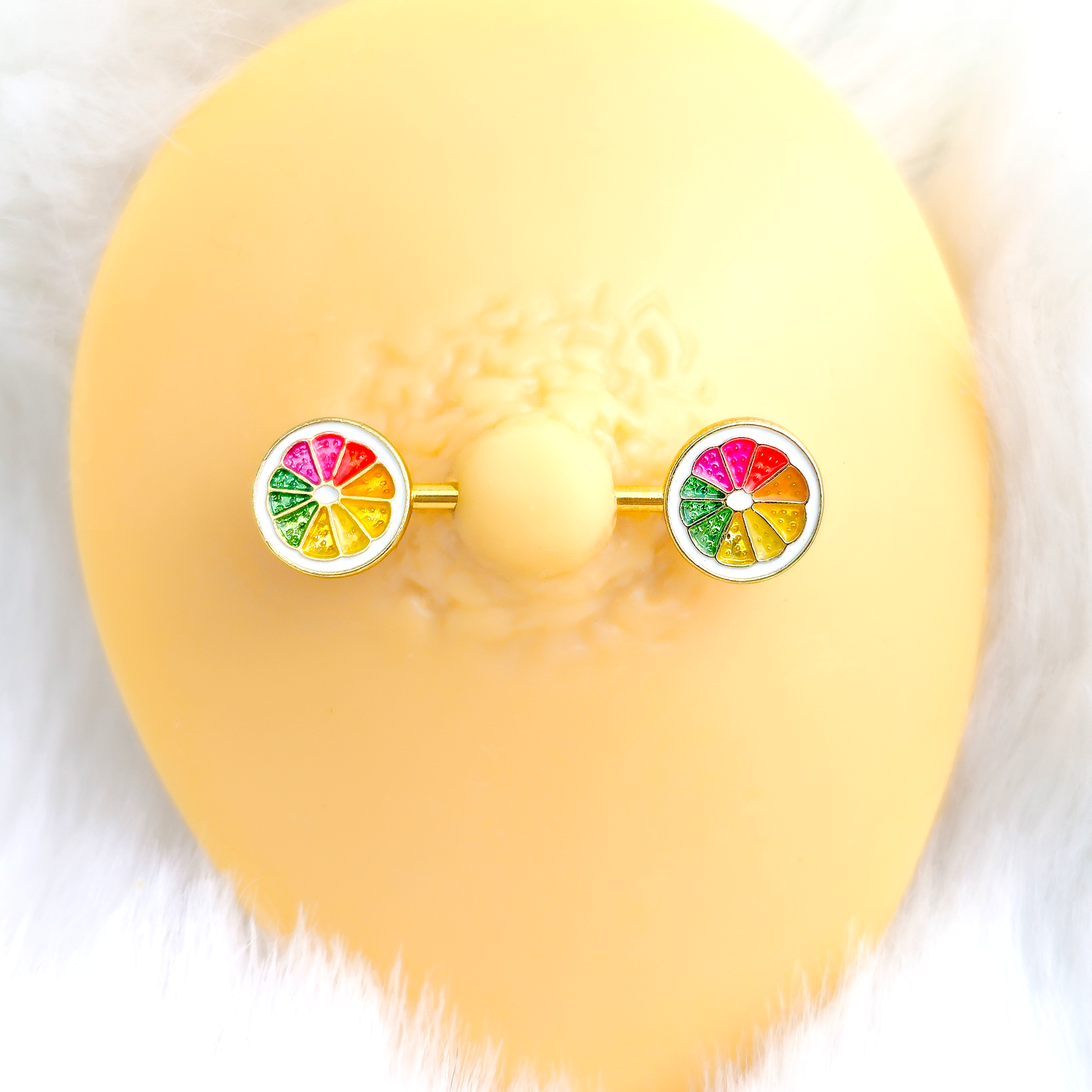 These grapefruits won't just make for a tasty breakfast, they'll glam up your nipple piercings at every meal with this 14 gauge nipple jewelry!! They're made with a 16mm gold tone PVD over 316L surgical grade stainless steel straight barbells and the ends each feature a sliced grapefruit charm with a ring of white around the outer edge - just like the real thing. However, these grapefruits have segments in a rainbow of colors! Now that's a juicy pair of nipple jewelry! Sold as set of two.Specifications