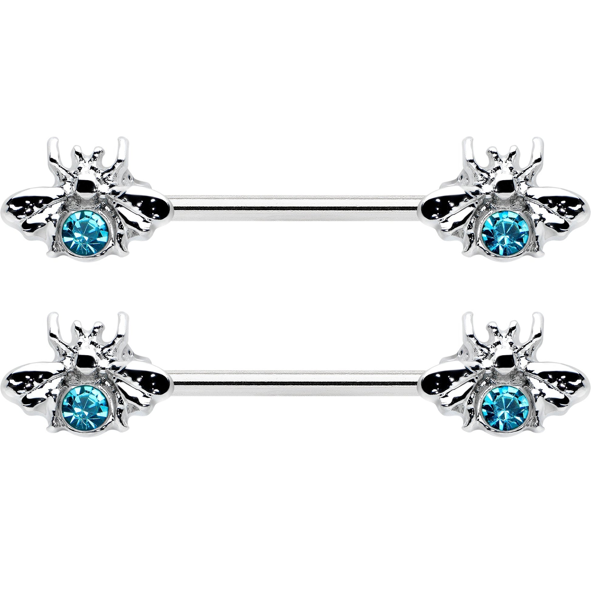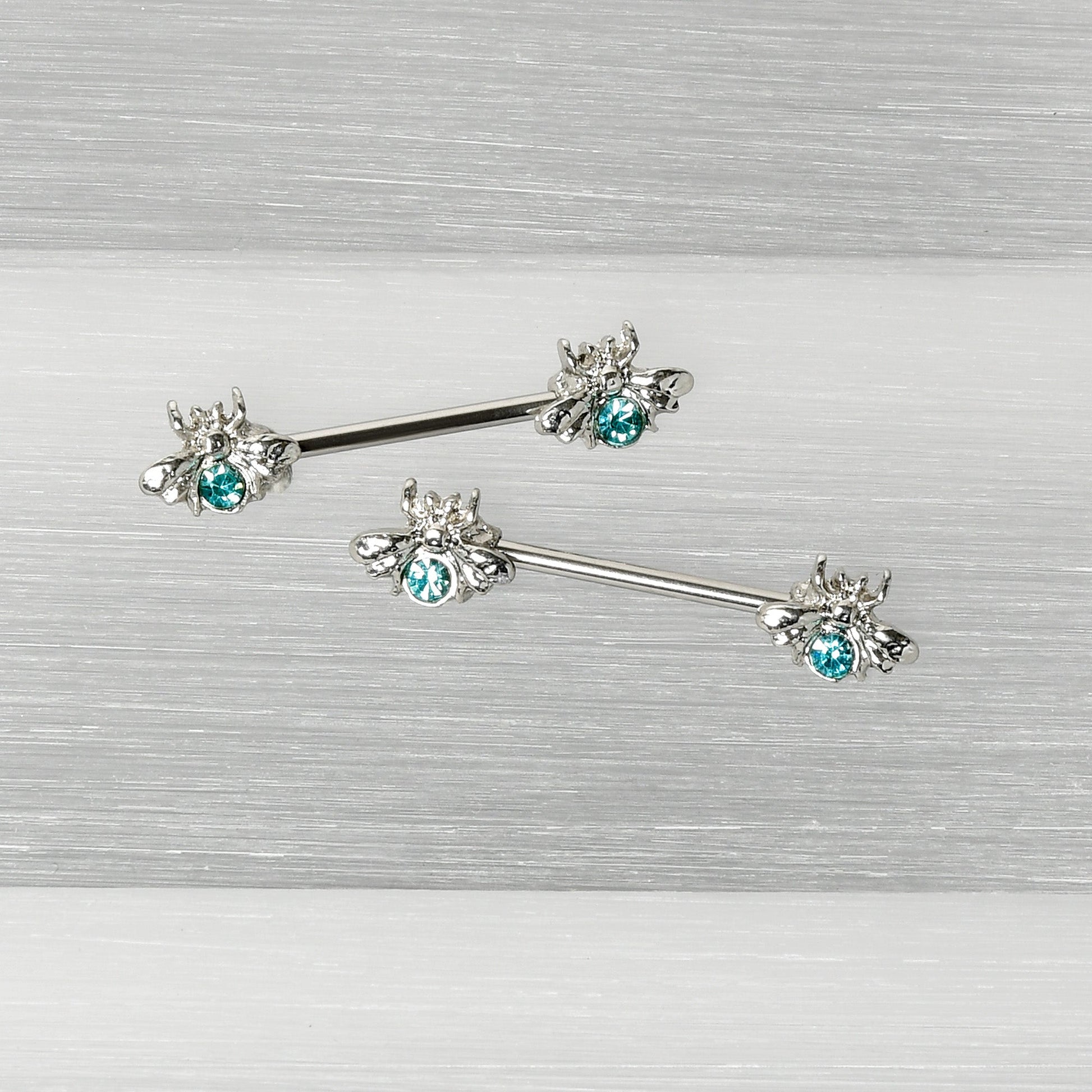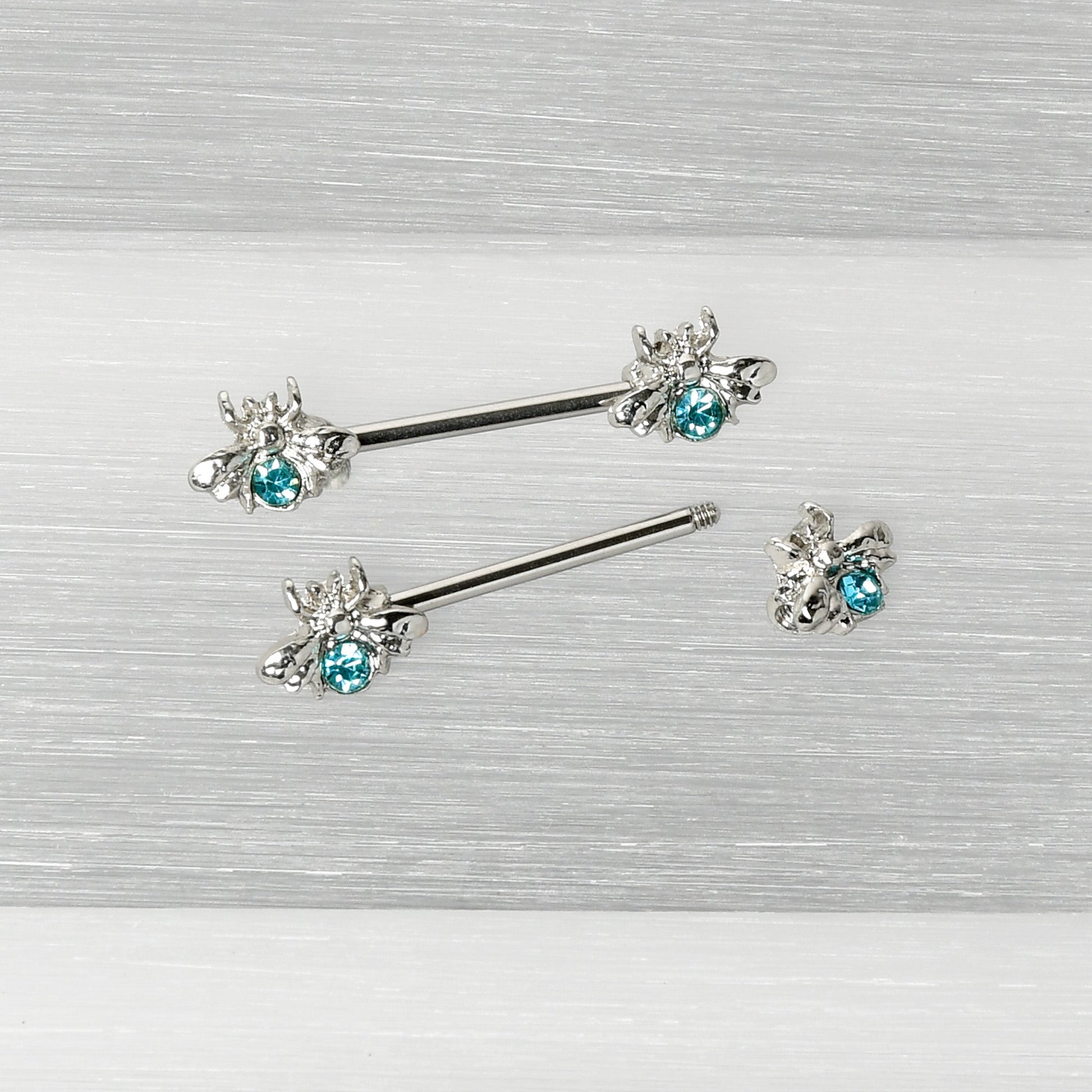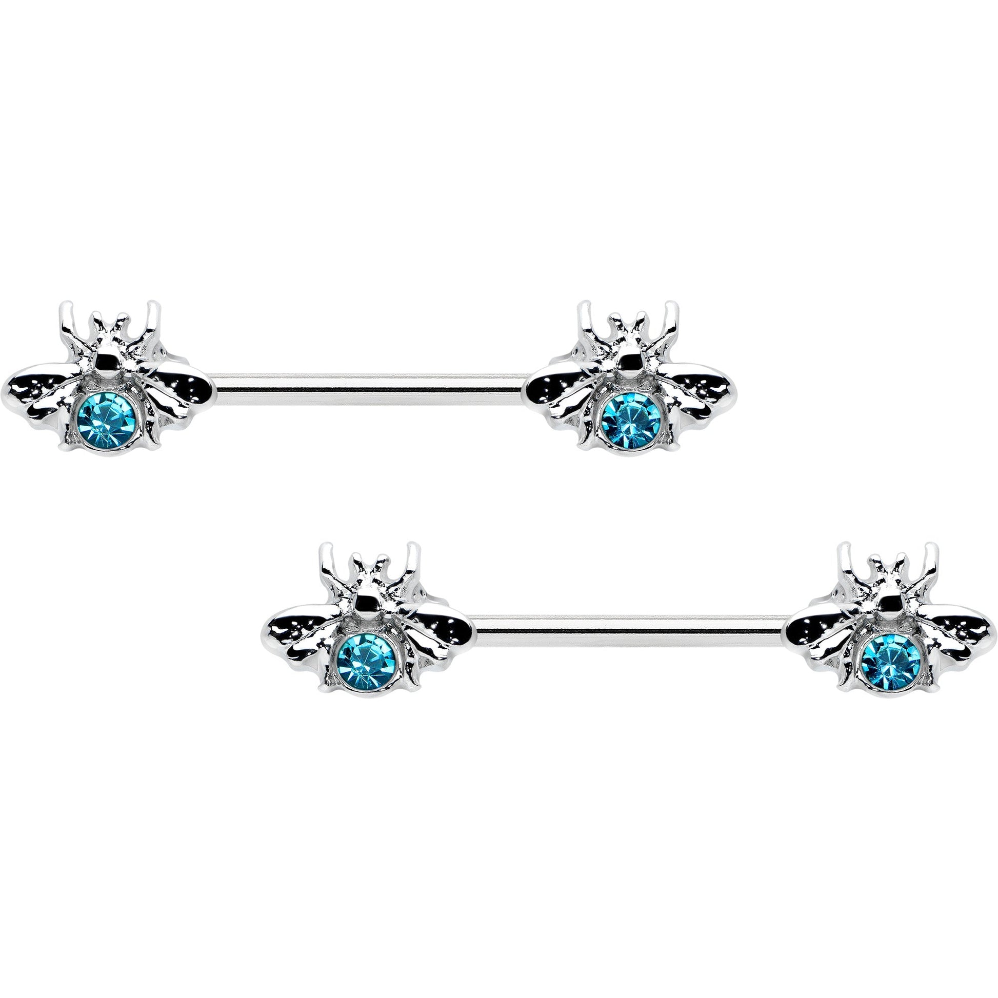 14G 9/16 Blue Gem Bee Beautiful Insect Barbell Nipple Ring Set