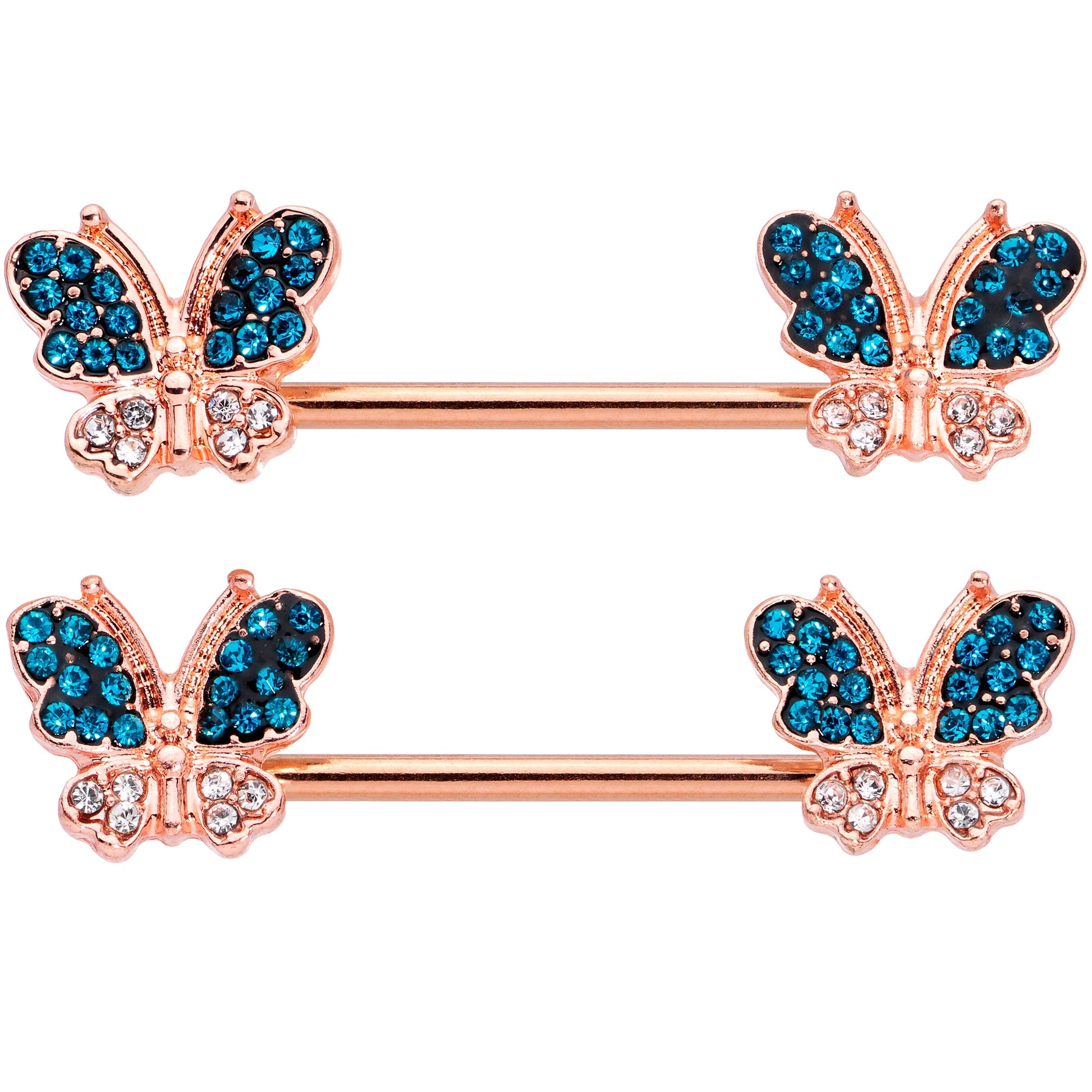 Turn your nipple piercinga into beautiful butterflies with these 14 gauge nipple rings! They're made with 14mm rose gold tone PVD over 316L surgical grade stainless steel straight barbells. Each of the ends features a butterfly charm, with their upper wings paved in aqua gems. The lower half of their wings are paved in clear gems. Transform your nipple piercinga into something truly glam with these beautiful butterfly nipple barbells! Sold as a set of two.Specifications