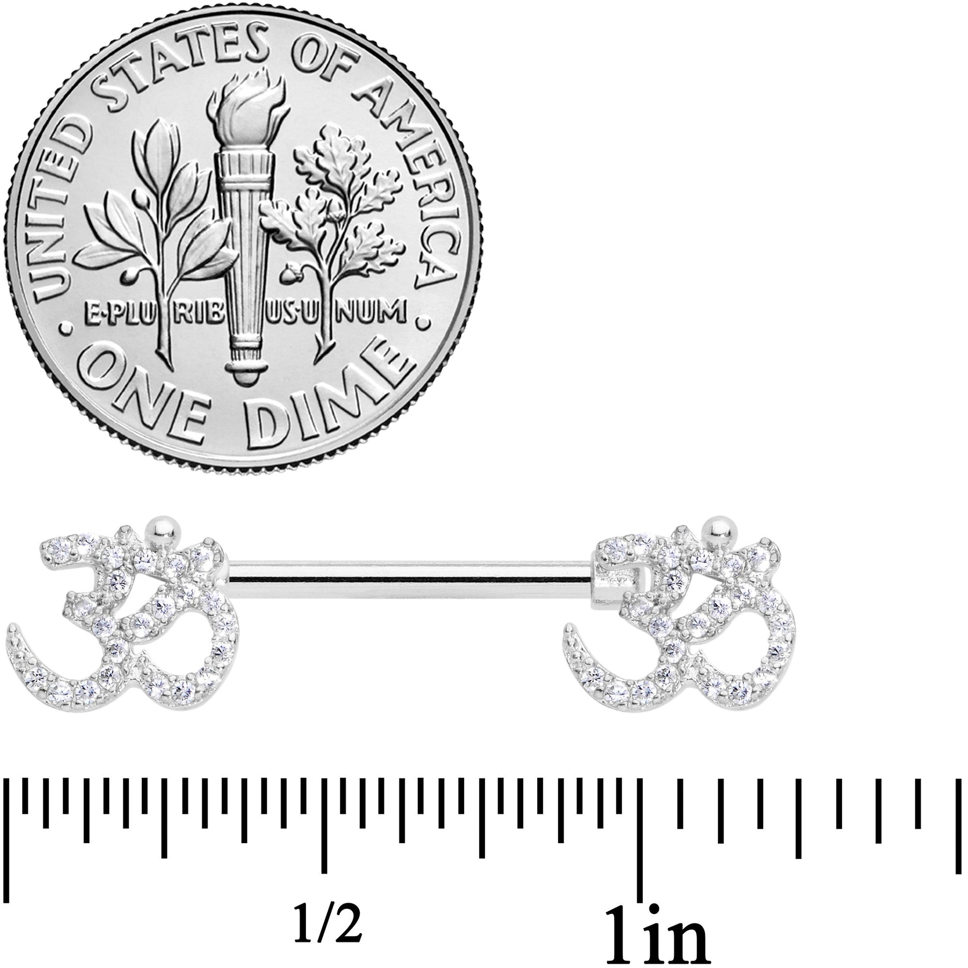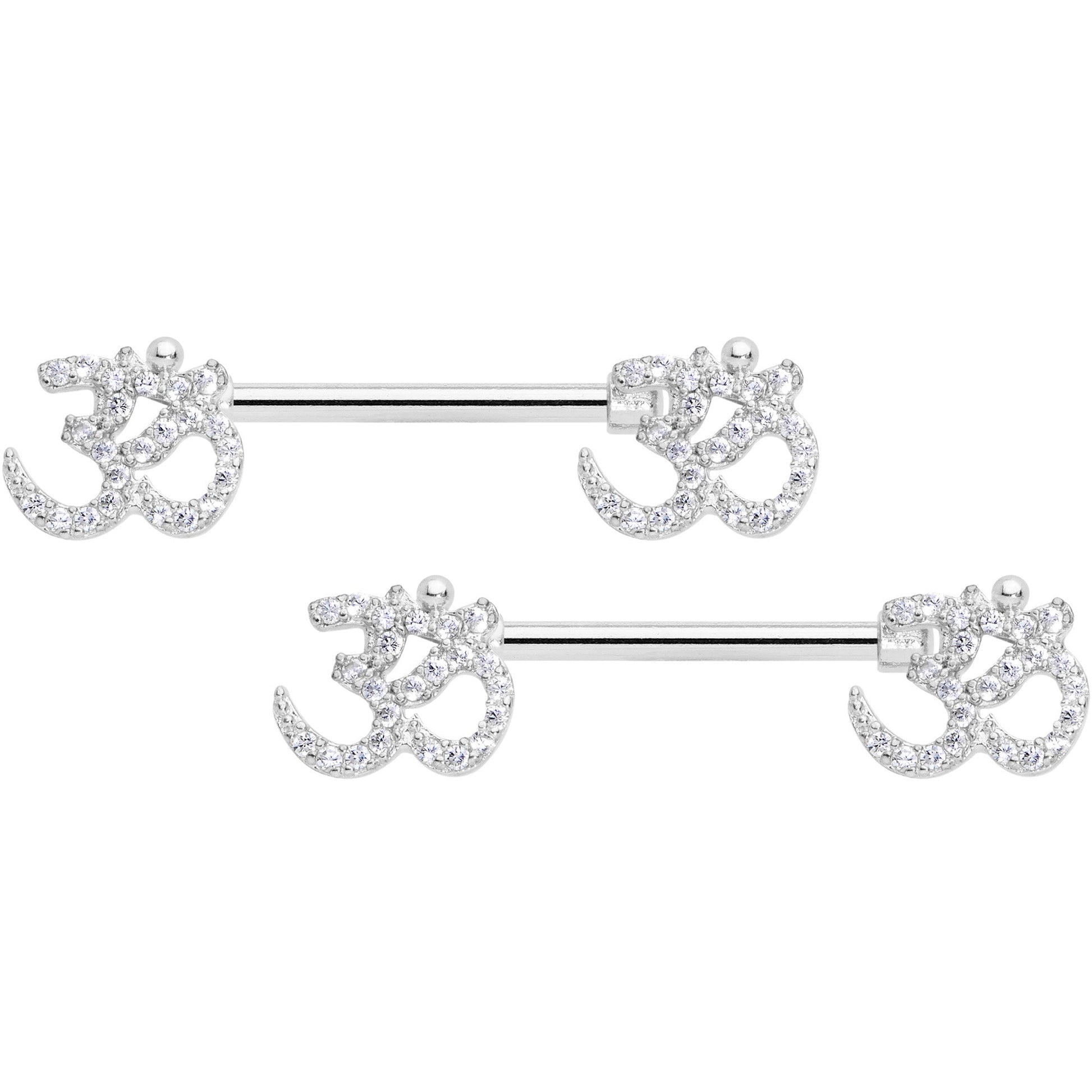 Om my goodness, that 14 gauge nipple jewelry looks gorgeous! It's made with 14mm durable 316L surgical grade stainless steel straight barbells and features charm ends of the Indian word OM. The oms are completely paved in small clear cubic zirconia gems, giving them a look that mixes the spiritual with the sumptuous. Whether you'd rather relax in a spa or a yoga studio, you can be sure your nipple piercings look om-mazing! Sold as a set of two.Specifications