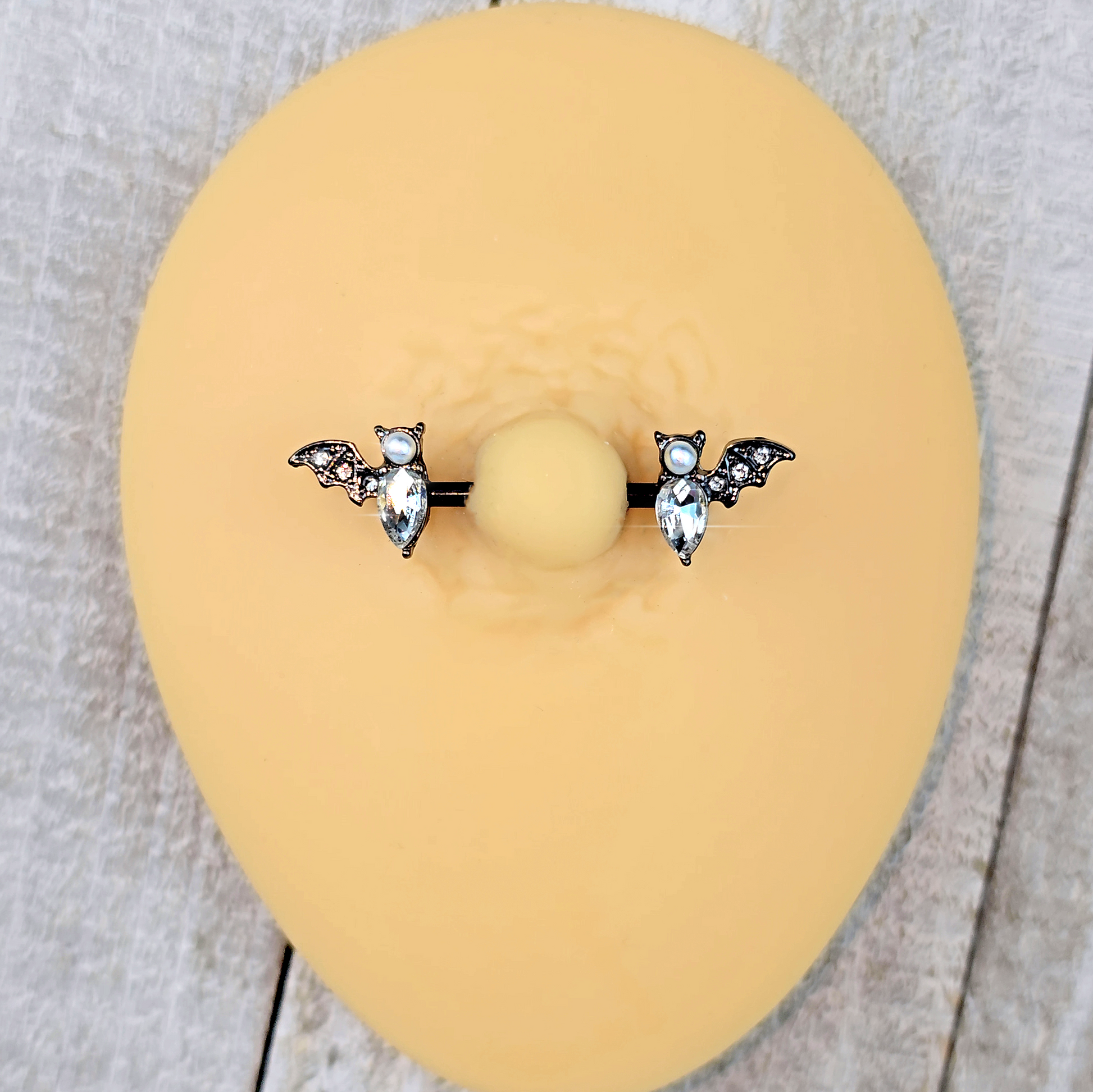 Let your piercing soar through the night skies like the bat on theis 14 gauge nipple jewelry! It's made with 14mm black plated over 316L surgical grade stainless steel straight barbells. The ends feature bat charms with their wings set with small clear gems. The bat's body is a single oval clear gem while its head is a white pearlescent orb. They're perfect for Halloween or to accessorize any gothic aesthetic. You're bound to be besotted with these Halloween bats! Sold as a set of two.Specifications