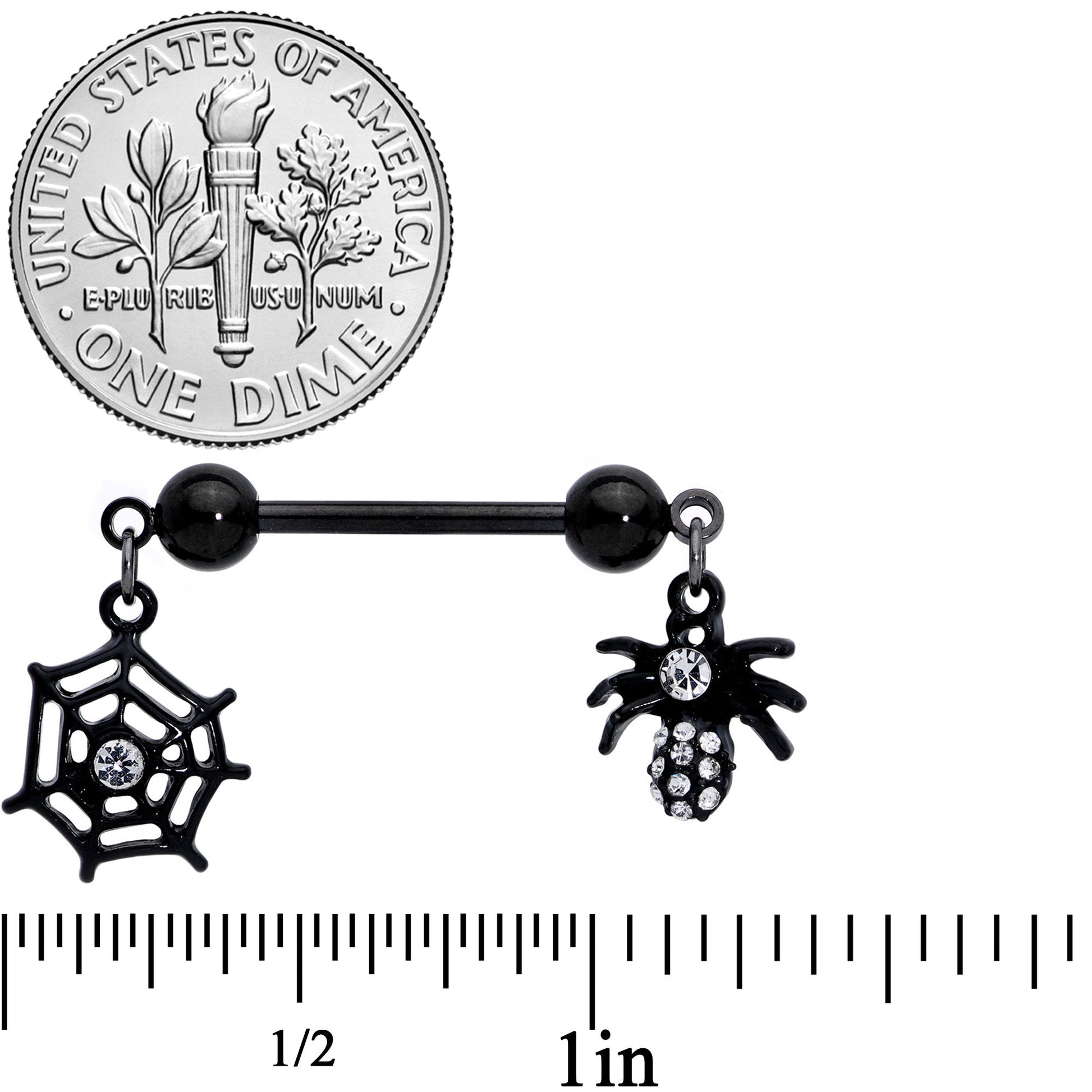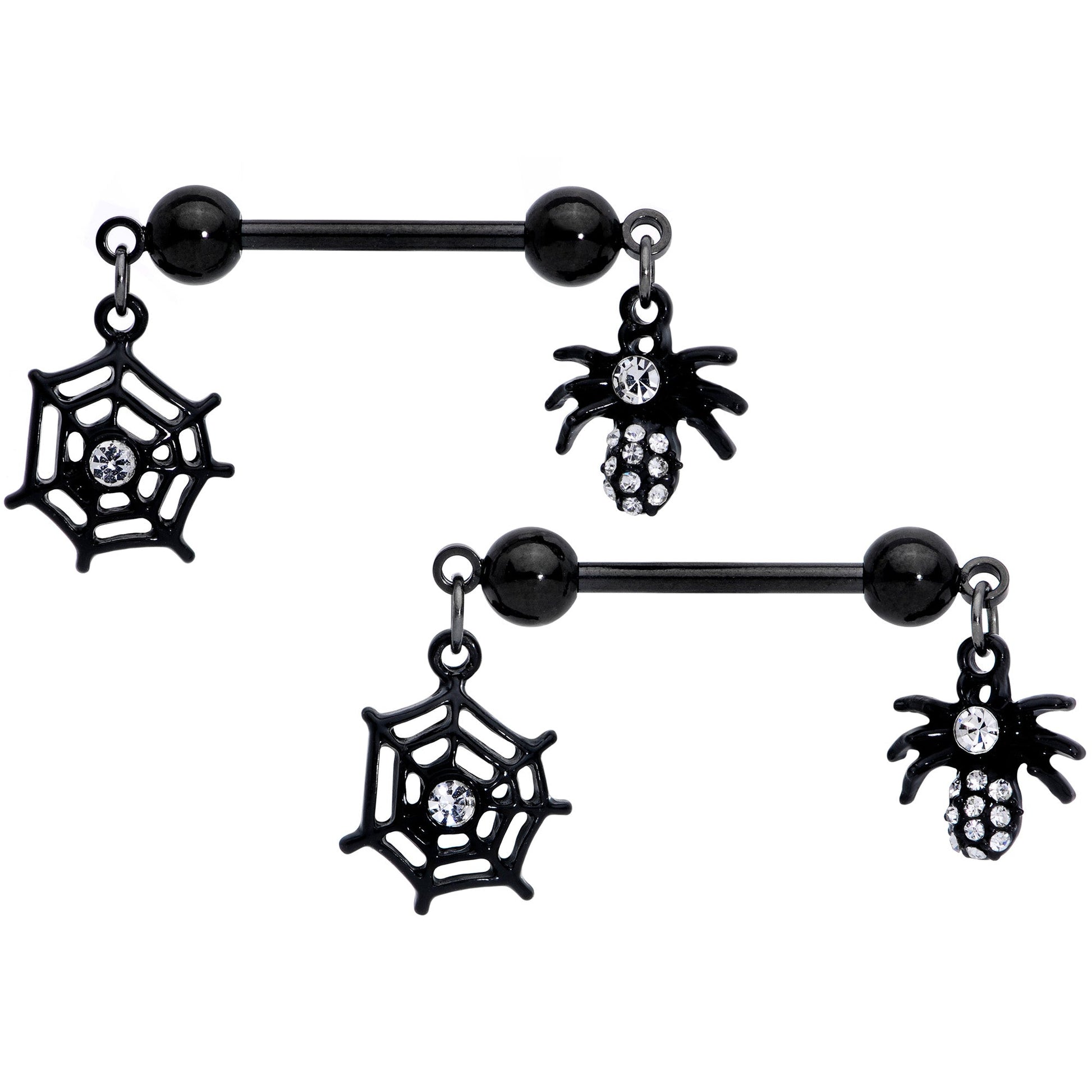 These appalling arachnids are also rather adorable on this 14 gauge nipple jewelry! It's made with 14mm black plated over 316L surgical grade stainless steel straight barbells with 5mm ball ends. Dangling from one ball ends are spider charms with clearly detailed legs and its body set with tiny clear gems for some glamorous contrast. They also feature a single clear gem for its head, giving it a unified feel. From the other ball end dangles black spiderweb charms, open-worked for an airy feel and set with clear gems at the center for a cohesive appearance. Let these creepy critters crawl into your nipple piercings this Halloween! Sold as a set of two.Specifications