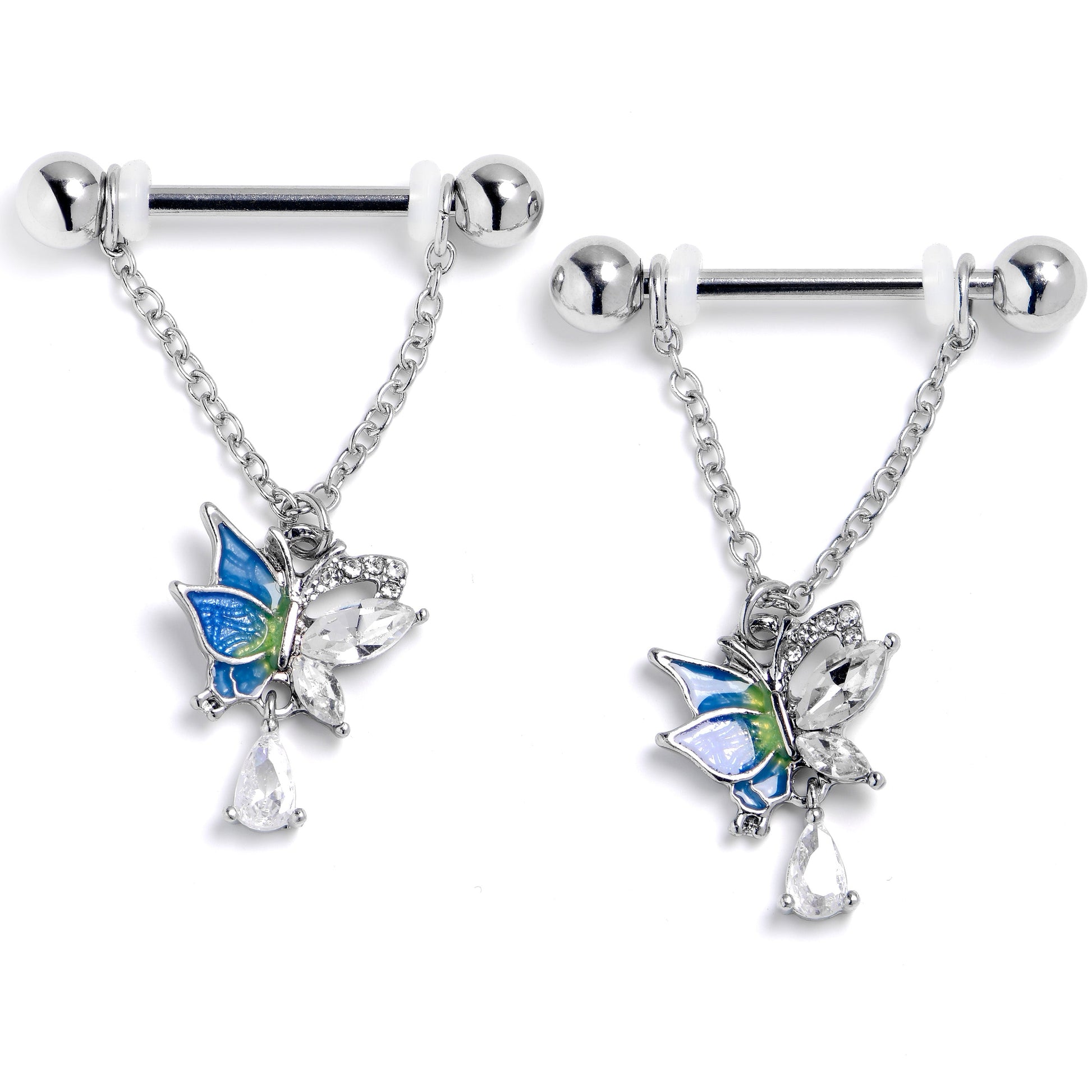 You will not have the blues when you are rocking this 14 gauge nipple jewelry. It is made with 14mm durable 316L surgical grade stainless steel straight barbells with 5mm ball ends. Each one features a dangling length of matching chain that supports a blue and green inlaid butterfly charm with one wing composed of clear gems. Dangling beneath each butterfly is a matching clear gem for added style. You will love having the blues with these delightful nipple piercing rings. Sold as a set of two.Specifications