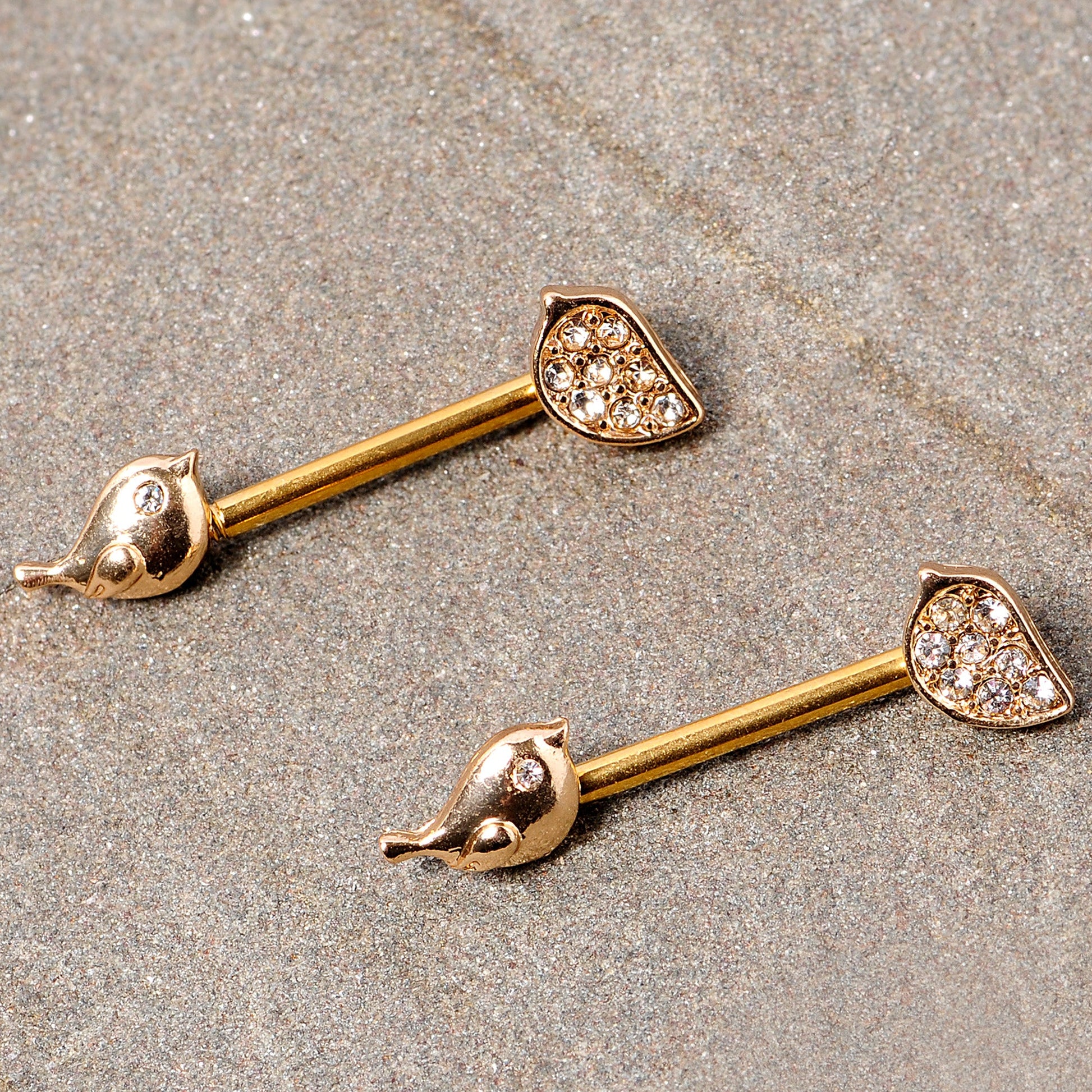 These little birds are looking for a place to perch...why not your nipple piercings? These 14 gauge nipple rings are made with 14mm gold tone PVD over 316L surgical grade stainless steel straight barbells. One end features a simply stylized bird charm with a clear gem eye and elegantly understated detailing. The other end is a perching bird charm, completely paved with small clear gems and providing balance and contrast to the piece. You'll love having these birds nest in your nipple piercings! Sold as a set of two.Specifications