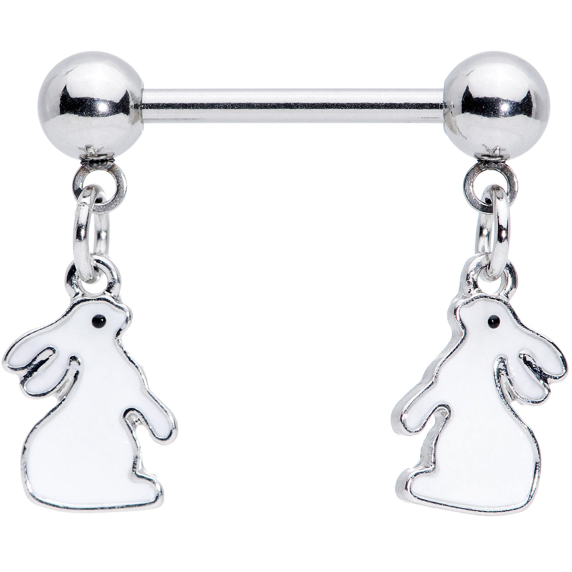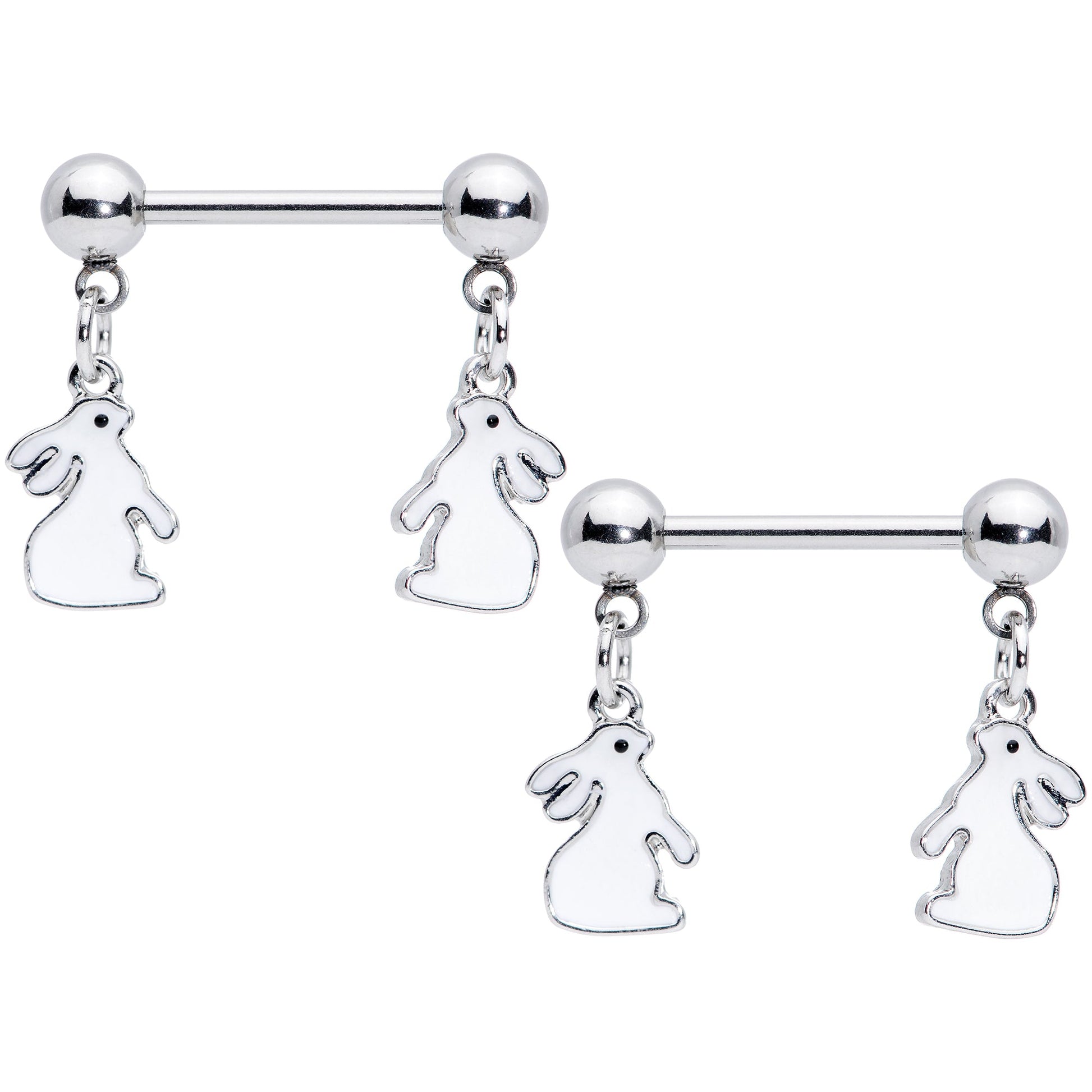 If you've been waiting all year to see the Easter bunny in action, we've made it a lot easier with this 14 gauge nipple piercing jewelry! It's made with a 14mm durable 316L surgical grade stainless steel straight barbells with 5mm ball ends. Each ball end features a white rabbit dangle charm sitting up to sniff the air...but when the lights go down these bunnies glow in the dark! So this Spring, you can check out the Easter Bunny even after the sun goes down with these adorable, glow in the dark nipple rings! Sold as a set of two.Specifications