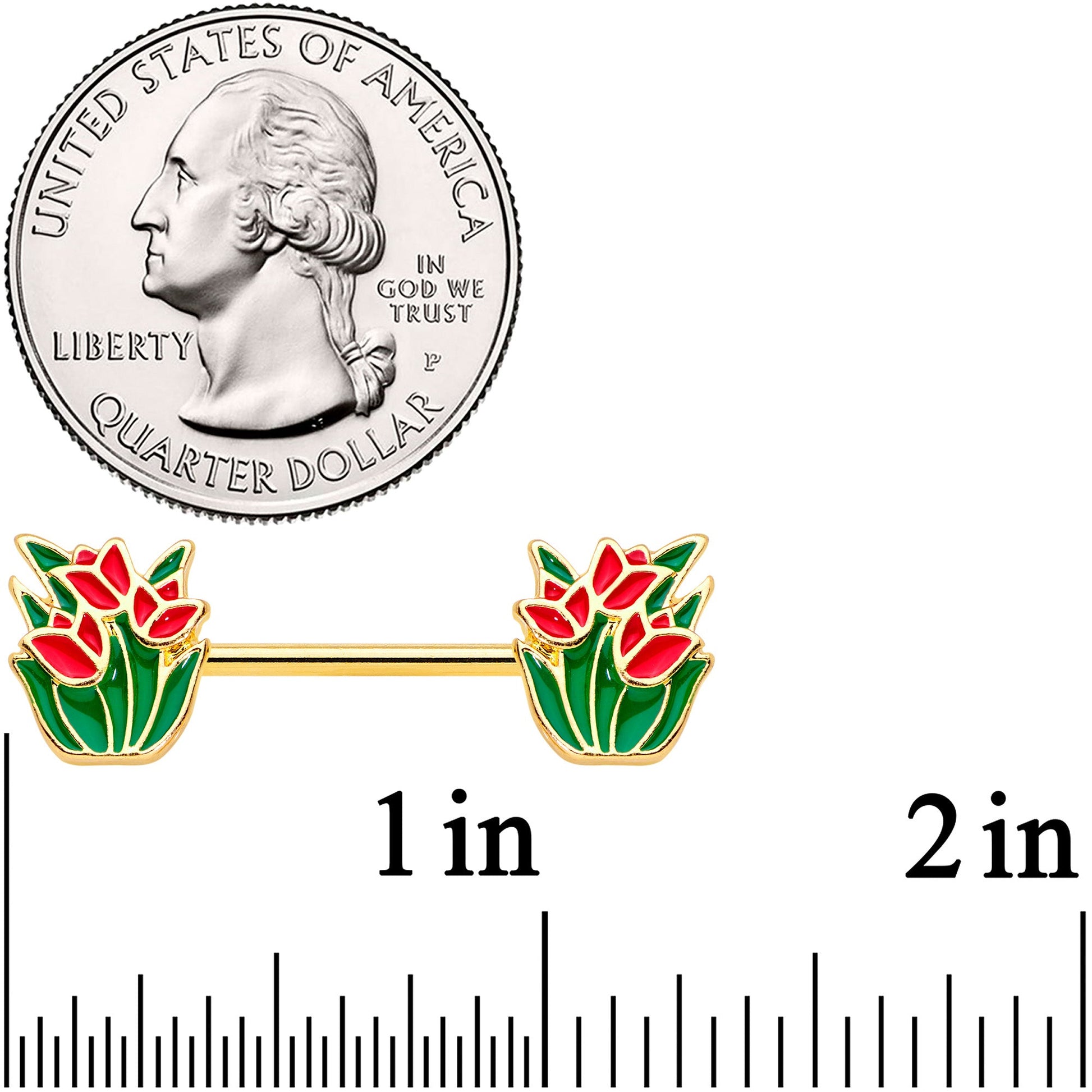 Treat yourself to some Springtime tulips with this 14 gauge nipple jewelry! It's made with 14mm gold tone PVD over 316L surgical grade stainless steel straight barbells. Each of the ends features a flower charm of tulips, with the leaves and stems inlaid in deep green and the blossoms inlaid in rich red. Score a sexy and stylish Spring look with these gorgeous floral nipple piercing rings! Sold as a set of two.Specifications