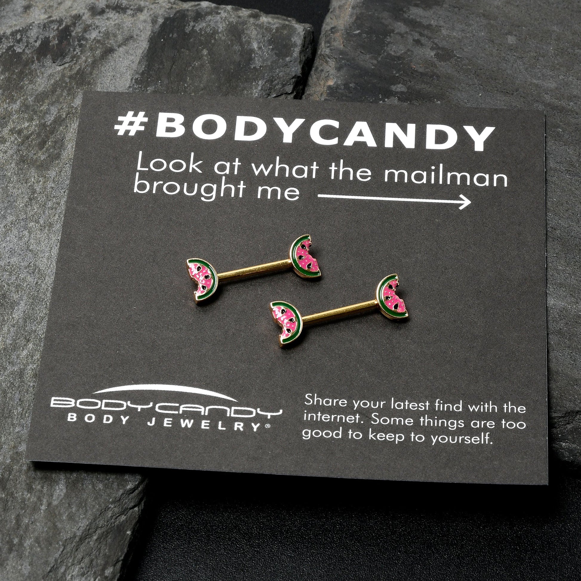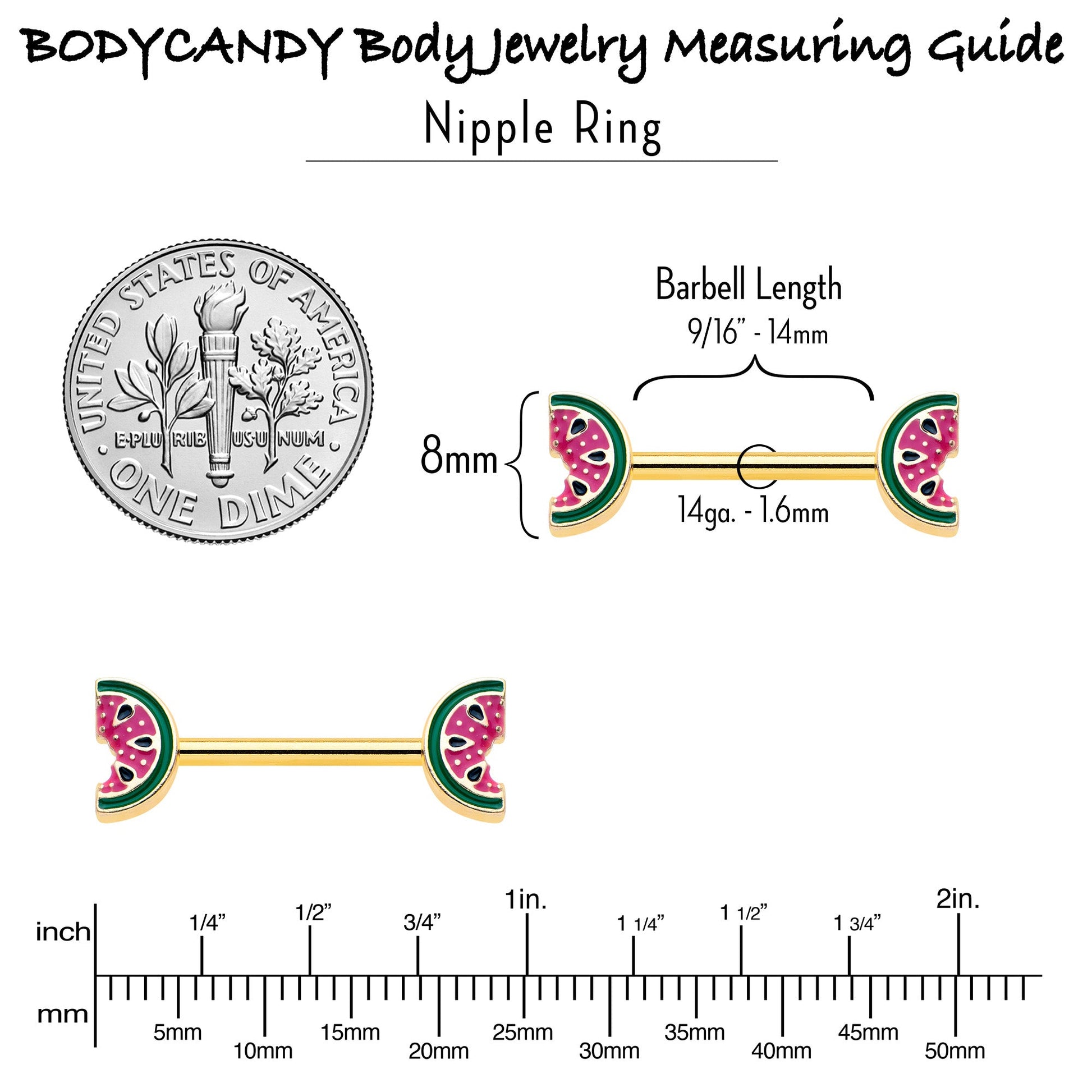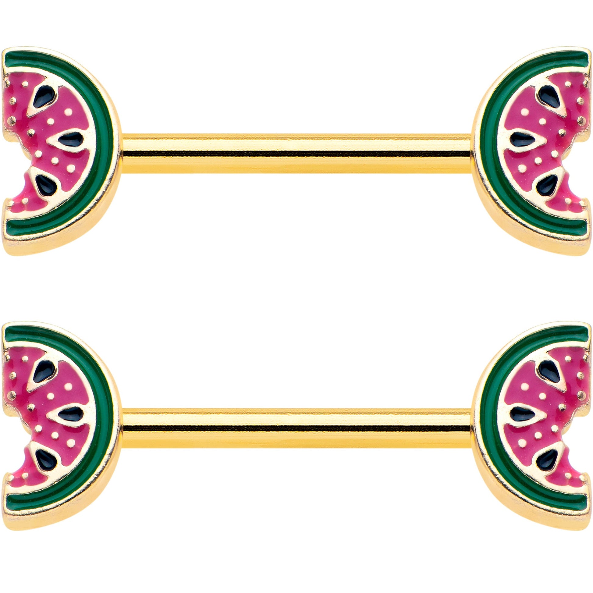 Take a bite of style with this tasty 14 gauge nipple jewelry. It is made with 14mm gold tone PVD over 316L surgical grade stainless steel straight barbells. Each of the ends features a watermelon slice charm, inlaid in red and green with black seed embellishments. The tasty fruits even have a bite already taken out. You too will find these yummy melon nipple piercing rings irresistible. Sold as a set of two.Specifications