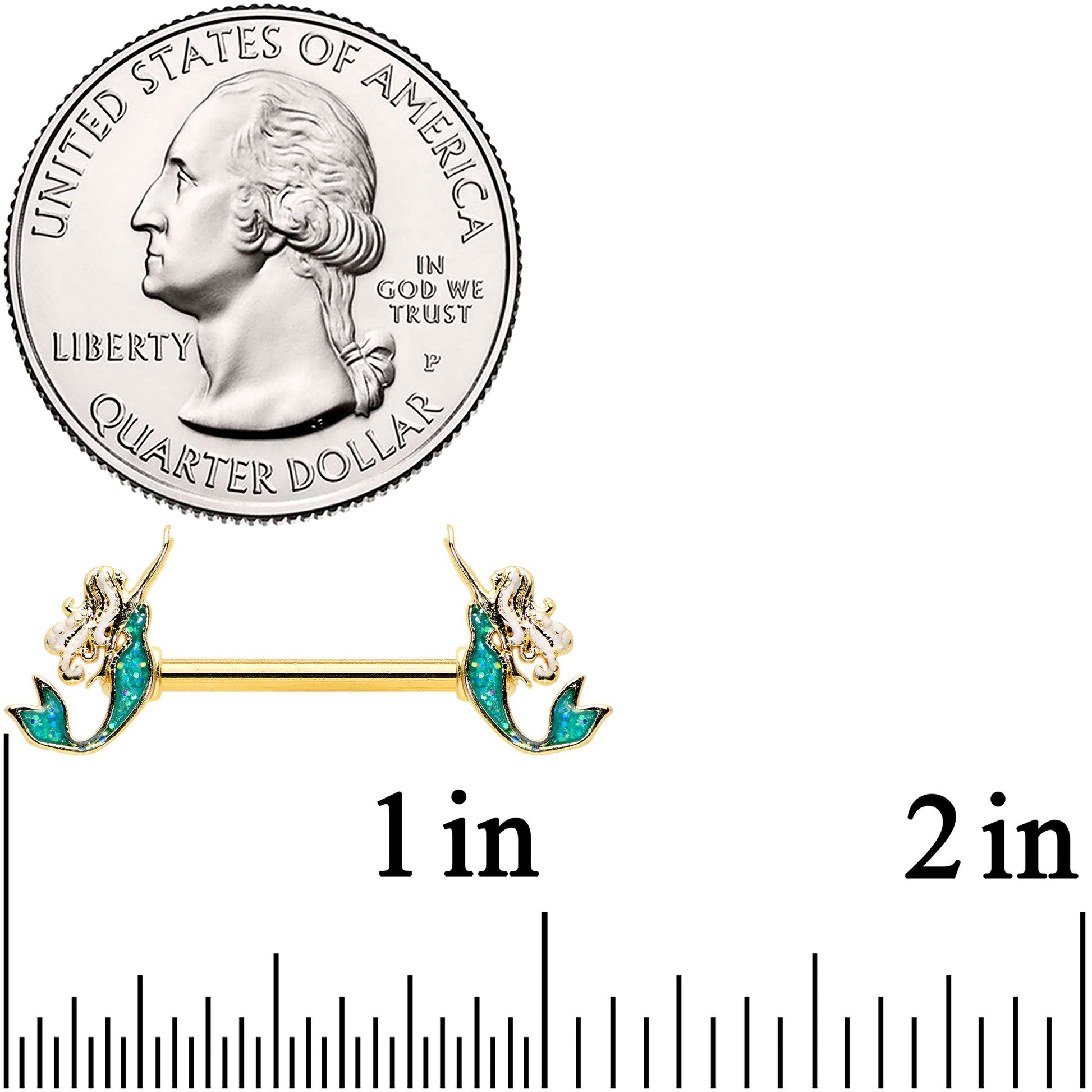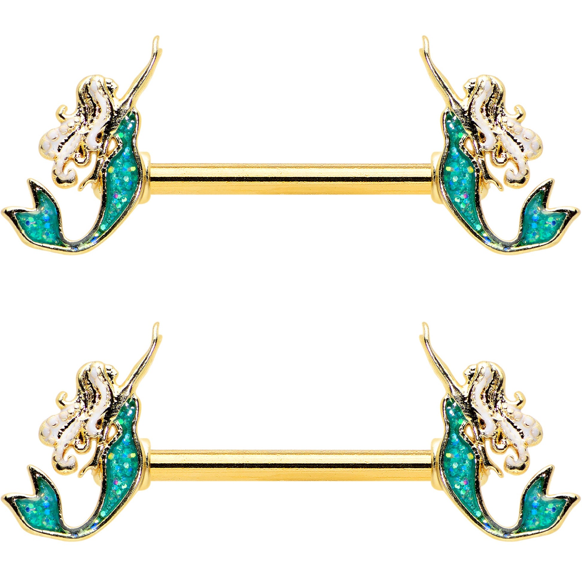 The mermaids on this 14 gauge nipple jewelry may live under the sea but they have city style! It's made with 14mm gold tone PVD over 316L surgical grade stainless steel straight barbells. Each of the ends features a mermaid charm, with their hair curling around them as they curve backwards. Their tails feature green faux opal inlay for a look that's on-trend and adds a lovely touch of color. Get nautical with these gorgeous mermaid nipple piercing rings! Sold as a set of two.Specifications