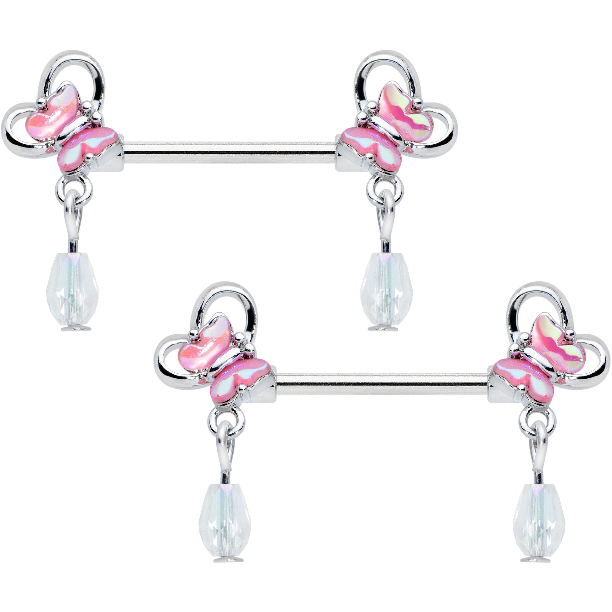 Open your heart to these 14 gauge nipple rings! They're made with 14mm durable 316L surgical grade stainless steel straight barbells. Each of the ends features an open heart charm, with a pink butterfly perching on it. The hearts each have a clear, faceted bauble dangling from it for added style. You can't help but let these beautiful butterfly nipple piercing rings into your heart! Sold as a set of two.Specifications