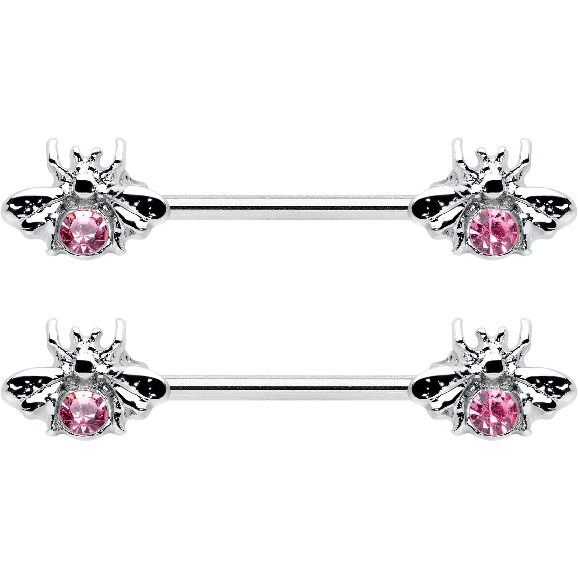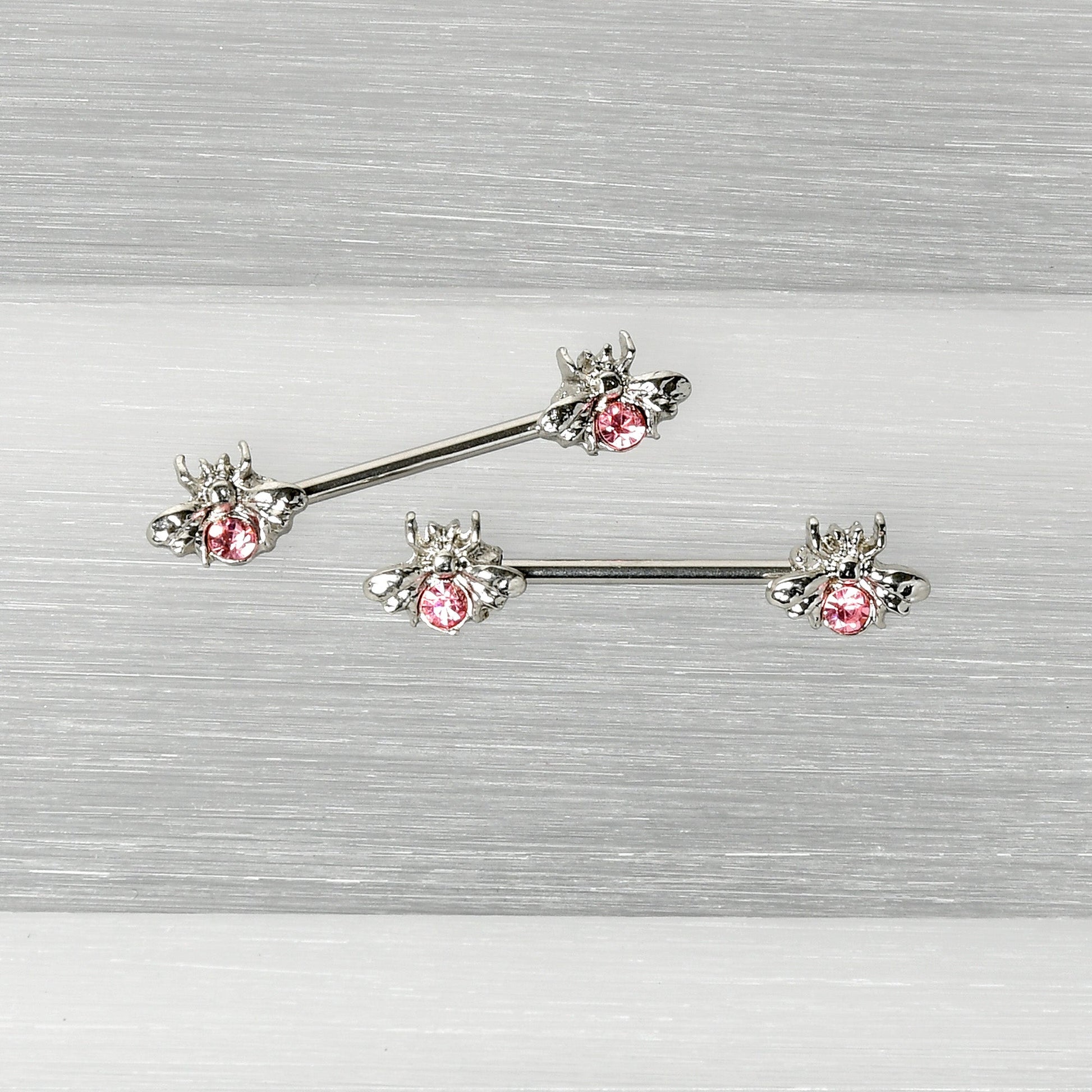 This 14 gauge nipple jewelry is sure to give you one honey of a new look! It's made with 14mm durable 316L surgical grade stainless steel straight barbells. Each of the ends features a bee charm, with the body composed of a single large pink gem. They also features stylized wings and legs for a realistic and airy appearance. These unconventional insect nipple piercing rings are sure going to make your nipple piercings look super sweet! Sold as a set of two.Specifications