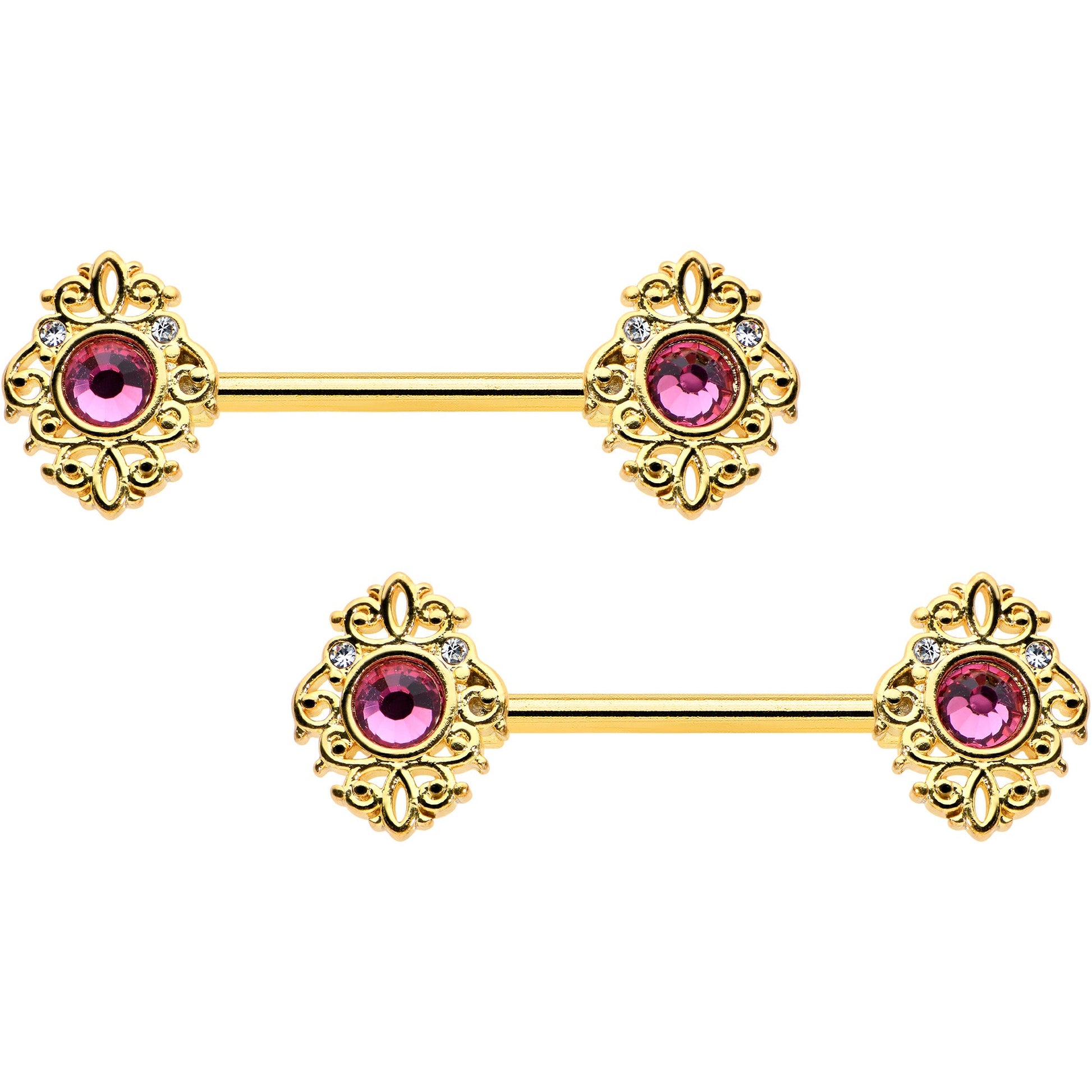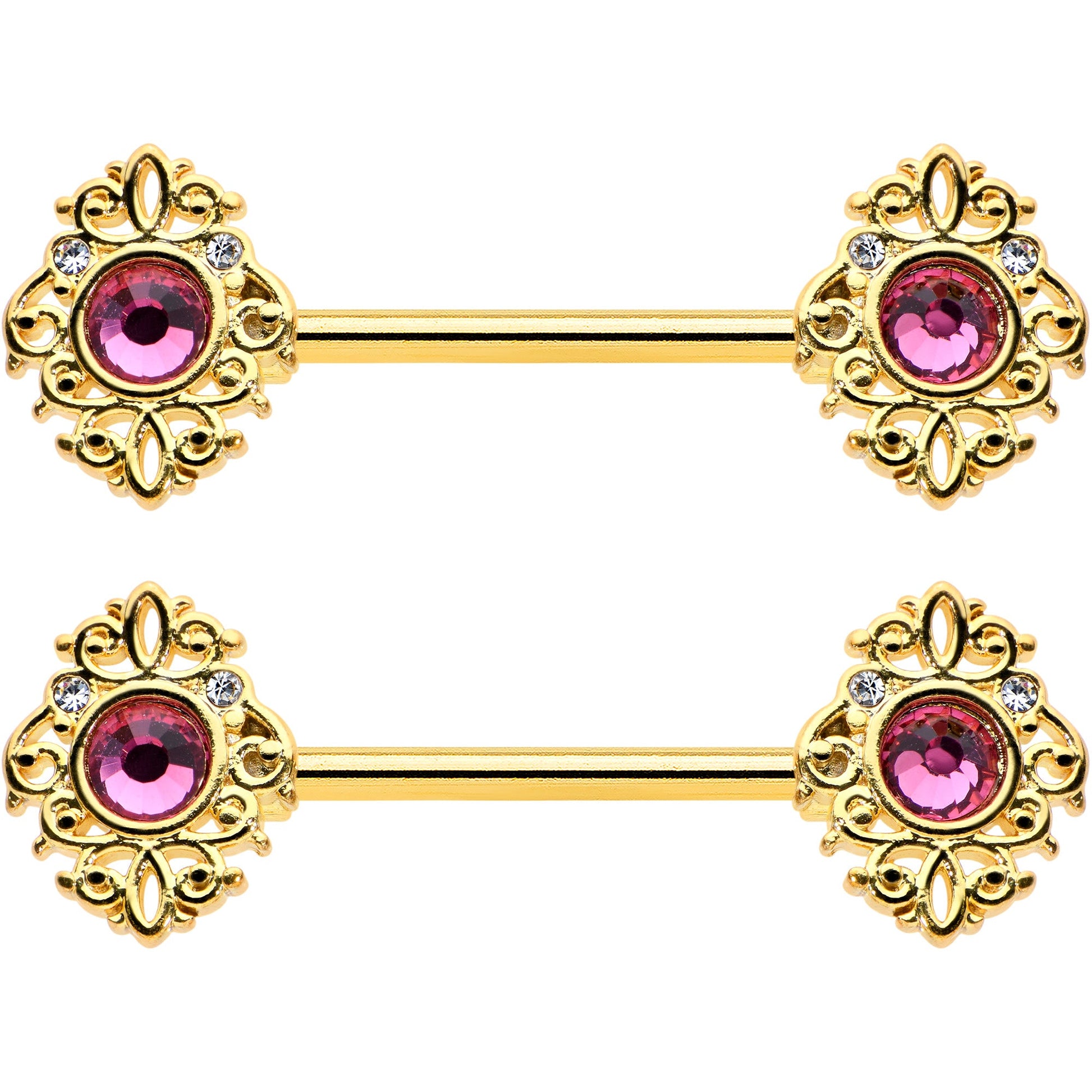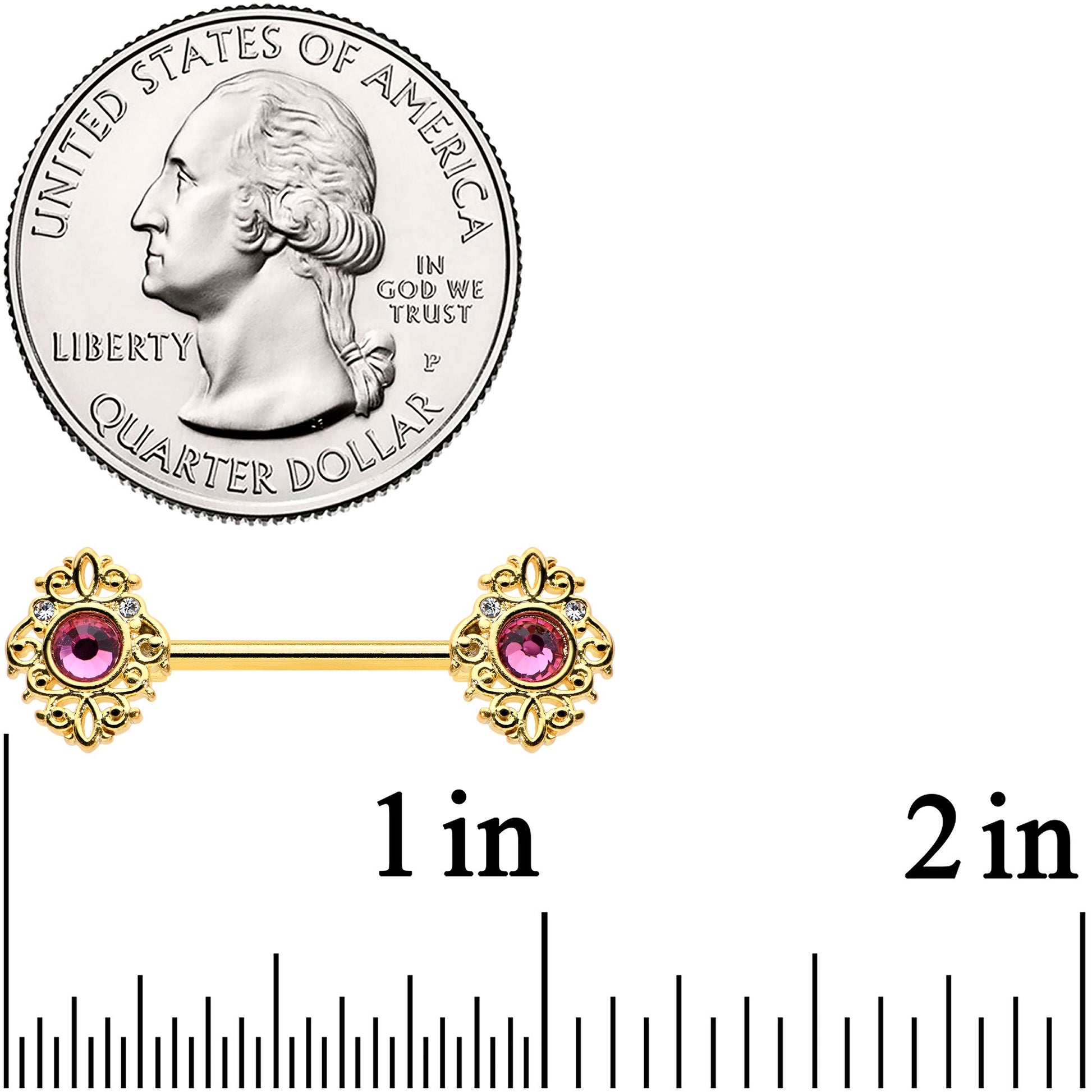 This 14 gauge nipple jewelry is sure to make you love its lacy look! It's made with 14mm gold tone PVD over 316L surgical grade stainless steel straight barbells. Each of the ends features a lacy, openwork charm with looping details. They're set at the center with a large pink gem and are each further embellished with a pair of small clear gems. These nipple piercing rings are sure to turn you into a lace lover! Sold as a set of two.Specifications