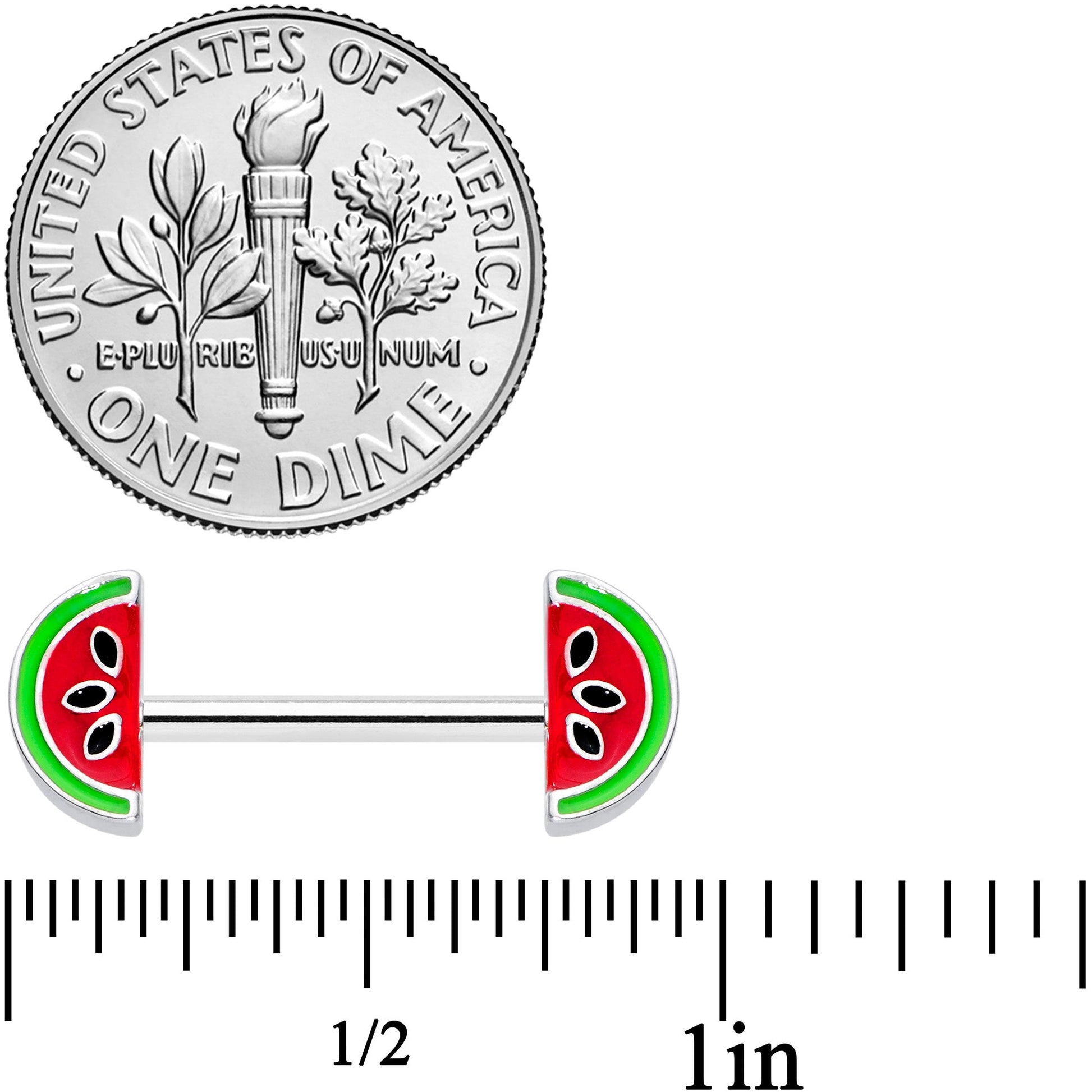 Want to hear something juicy? Check out this 14 gauge nipple jewelry with its delicious-looking fruit ends! It's made with 14mm durable 316L surgical grade stainless steel straight barbells. The ends are each green and red slice of watermelon charms, complete with black seeds just like the real deal! Give your nipple piercings a taste of the sweetness of a summer melon with these fabulous fruit-themed summer snack nipple rings! Sold as a set of two.Specifications
