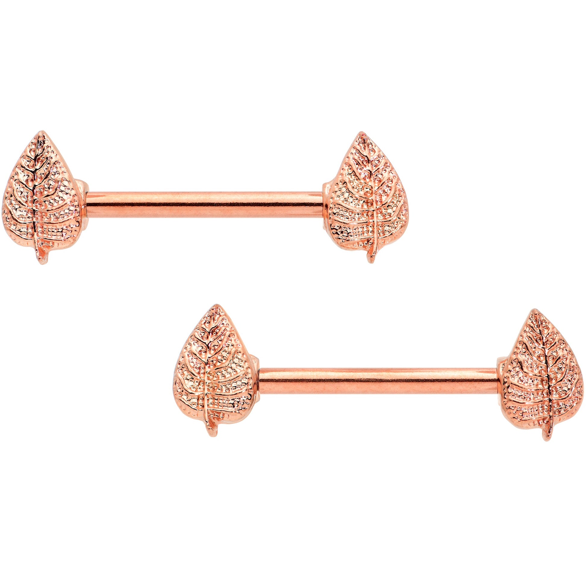 Get ready to Fall....in love with this 14 gauge nipple jewelry! It's made with 14mm rose gold tone electroplated over 316L surgical grade stainless steel straight barbells. Each of the ends features an Autumn leaf charm. It matches the tone of the barbell for a cohesive appearance and features textured detailing for an added touch of realism. Let these lovely leaves add an autumnal touch to your nipple piercings with these lovely leaf nipple rings! Sold as a set of two.Specifications