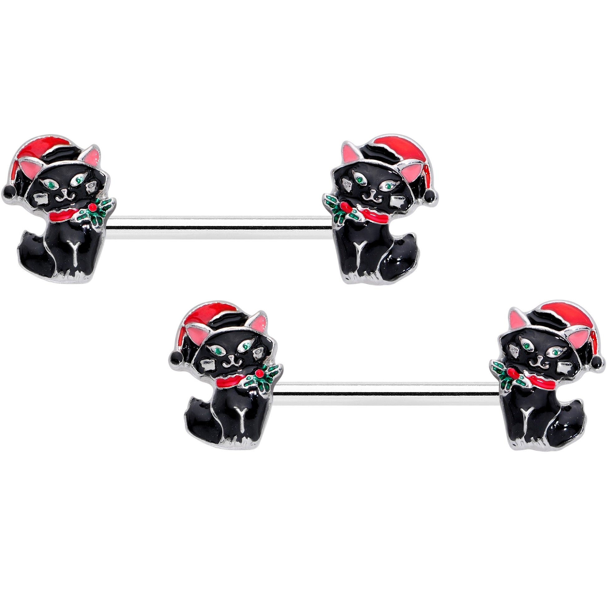 If you're ready for the witching hour and excited for presents too then you'll love these 14 gauge nipple piercings with tons of Christmas style. Made with 14mm durable 316L surgical grade stainless steel straight barbells, this nipple jewelry features a black cat charm wearing Santa's cap!Specifications