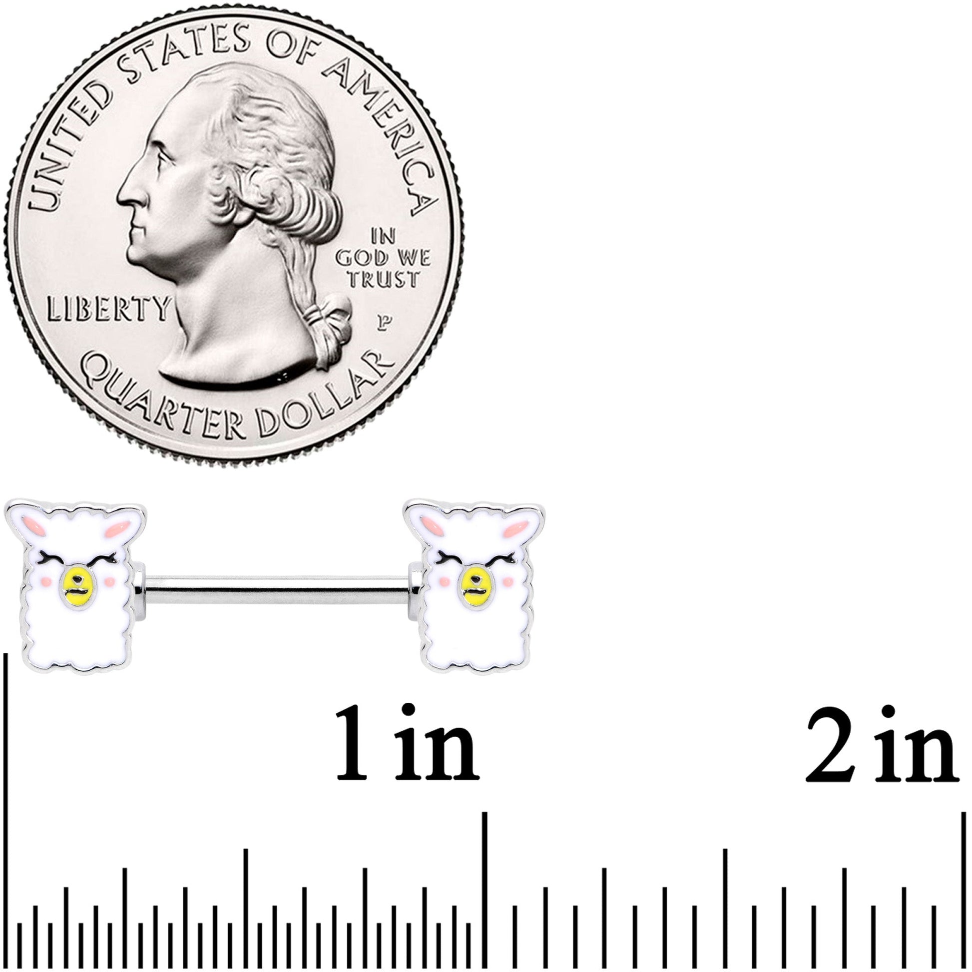 This is one pair of nipple jewelry that's sure to alpaca punch! The 14 gauge nipple rings are made with 14mm durable 316L surgical grade stainless steel straight barbells. The ends feature charms of a white llama with pink and yellow detailing to bring out every feature on its sweet face. You're bound to get a whole llama love for this adorable nipple jewelry! Sold as a set of two.Specifications