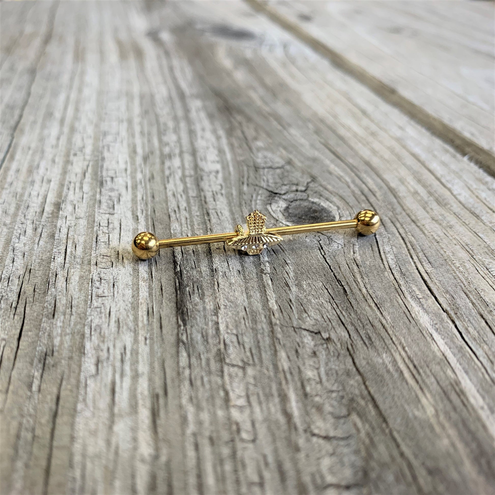 The aliens have come to take you away....and you'll look amazing when it happens with this 14 gauge helix barbell! It's made with a 1 1/2" gold tone plated over 316L surgical grade stainless steel barbell with 5mm ball ends. It features a charm of an alien spacecraft, with three clear gems to represent the windows and textured detailing for the beam they're sending out. This piece has a classic Art Deco feel to it that adds a gorgeous contrast to a modern theme. And you can slide the UFO up and down the barbell to get just the look you're after! You're sure to love letting these aliens make a new home for themselves in your ear with this striking barbell earring.Specifications