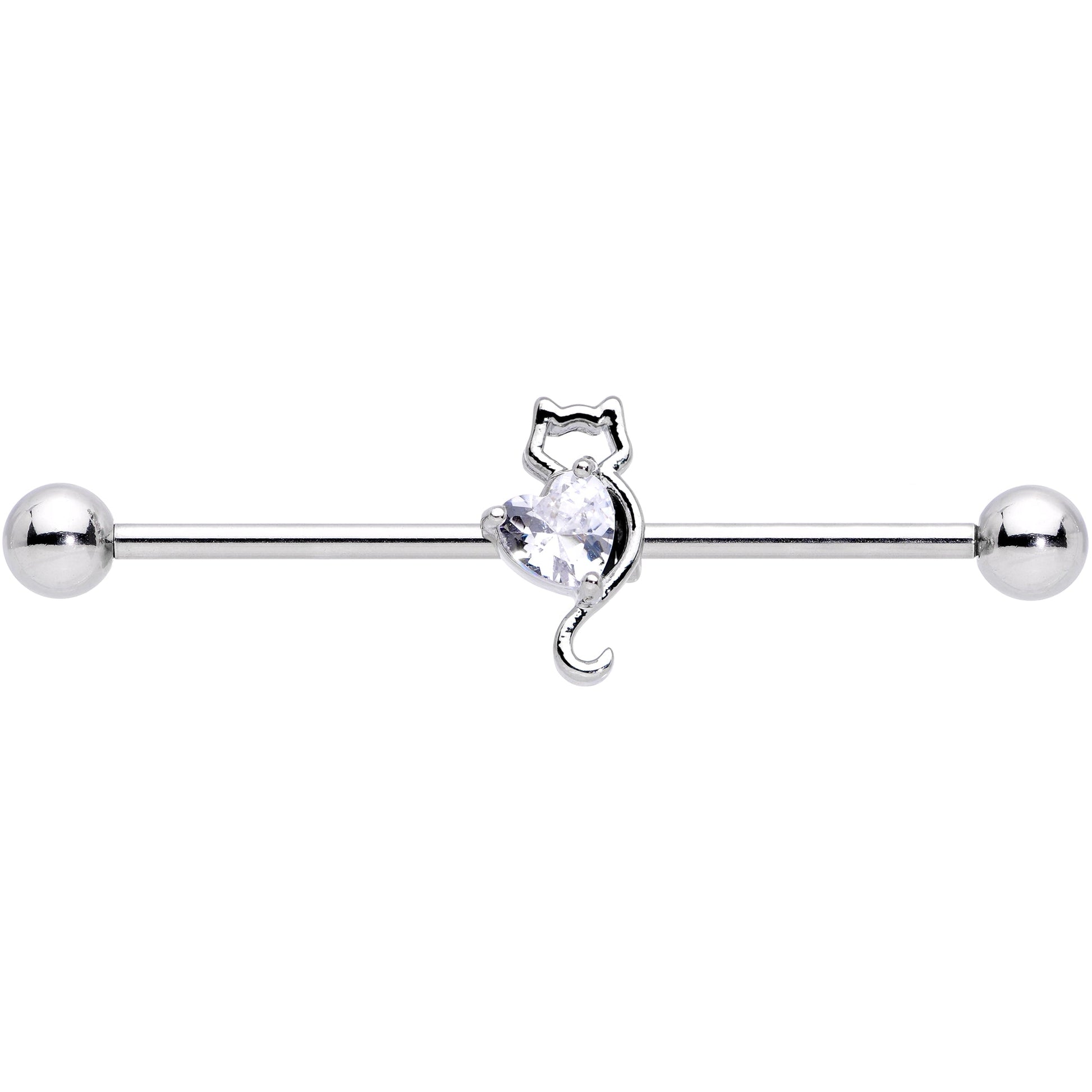 If kitty cats are your favorite to cuddle, then this kitten themed 14 gauge industrial barbell is perfect for you! With a beautiful heart shaped clear gem, kitty cat ears, and a curled tail, this kitten is the cutest. The moveable kitten charm is set on a 1 1/2" length straight barbell made with durable 316L surgical grade stainless steel. Kitty lovers line up!Specifications