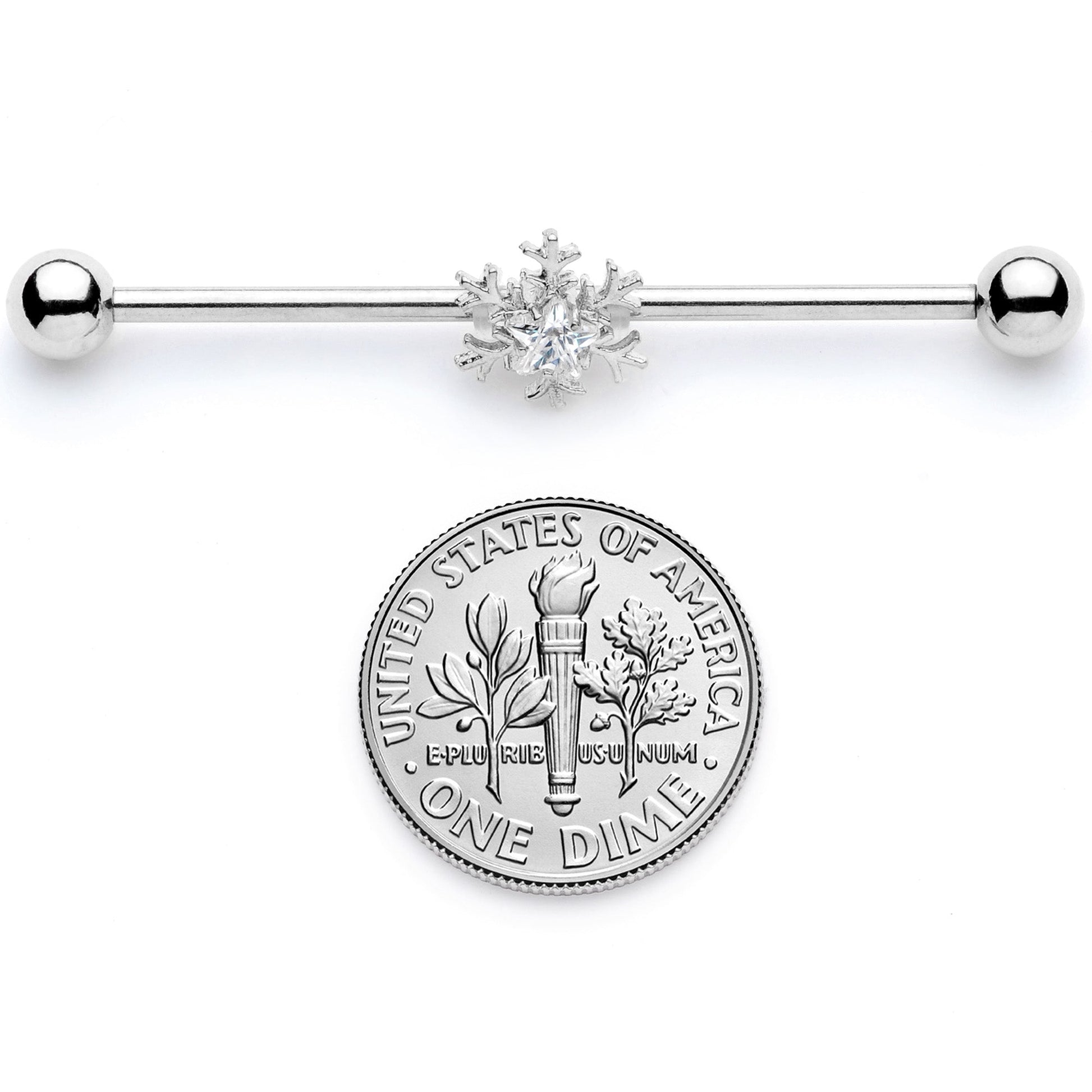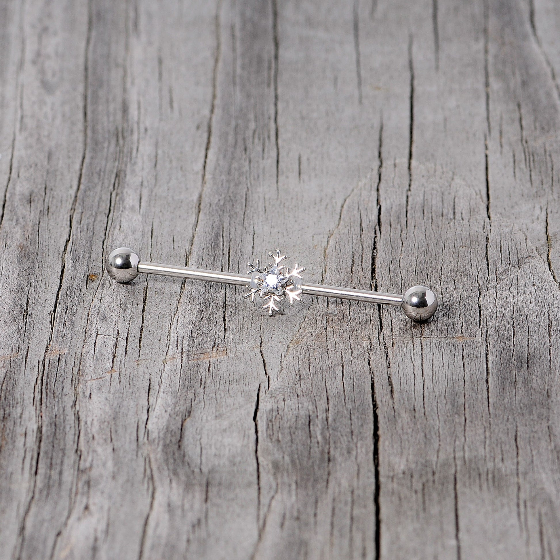 If you can't wait to walk around in a winter wonderland this Christmas season then you will love this 14 gauge industrial earring because it is so cool! Made with a 1 1/2" durable 316L surgical grade stainless steel straight barbell, this barbell industrial features a moveable winter snowflake charm set with clear gems. Wishing you happy holidays and tons of winter snow days!Specifications