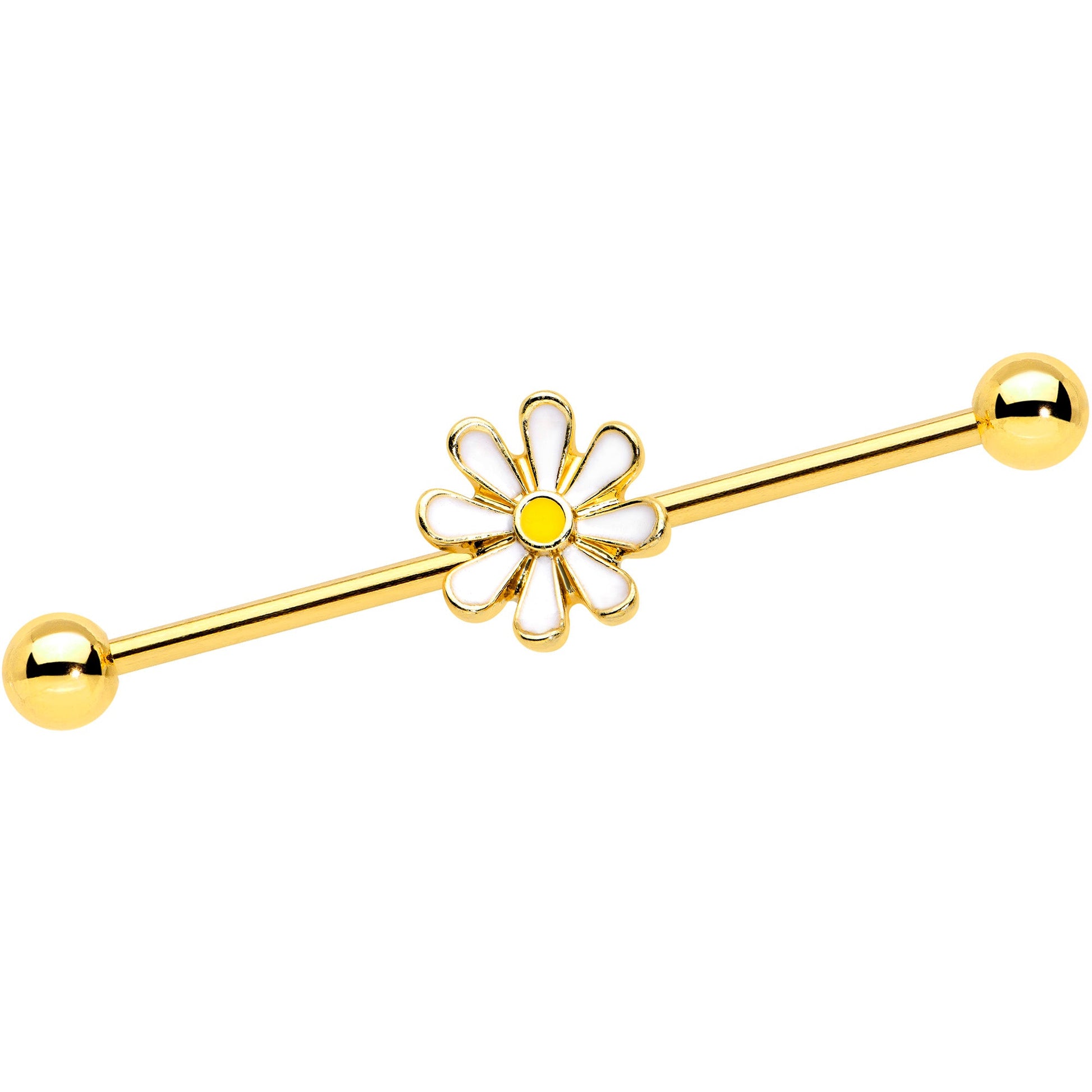 14 Gauge Gold Tone Whimsical Daisy Flower Industrial Barbell 38mm