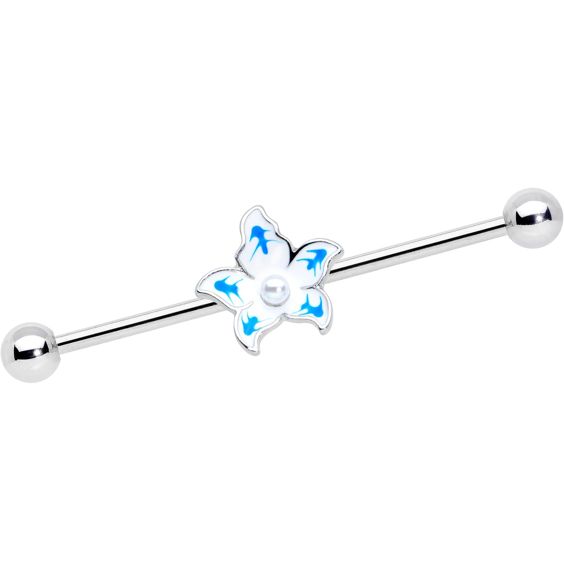 14G Pearly White Orb Blue Flower Industrial Barbell 38mm