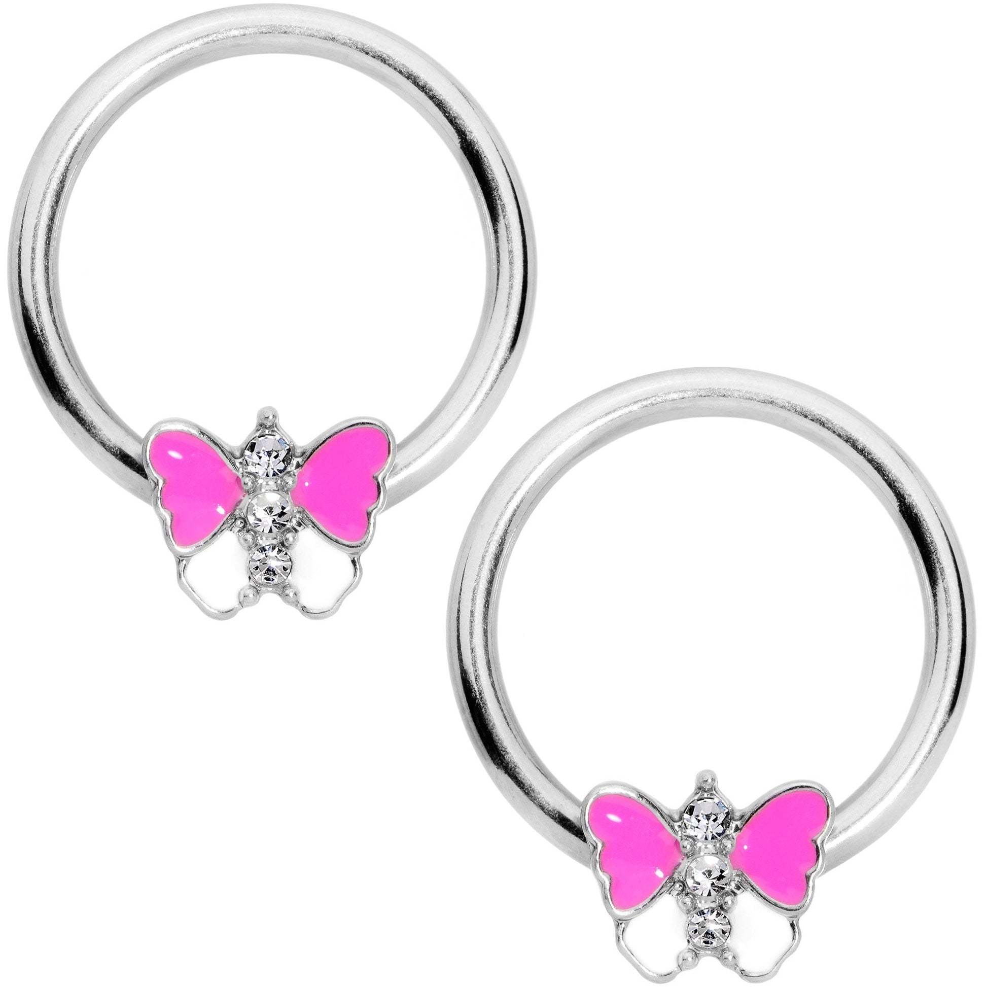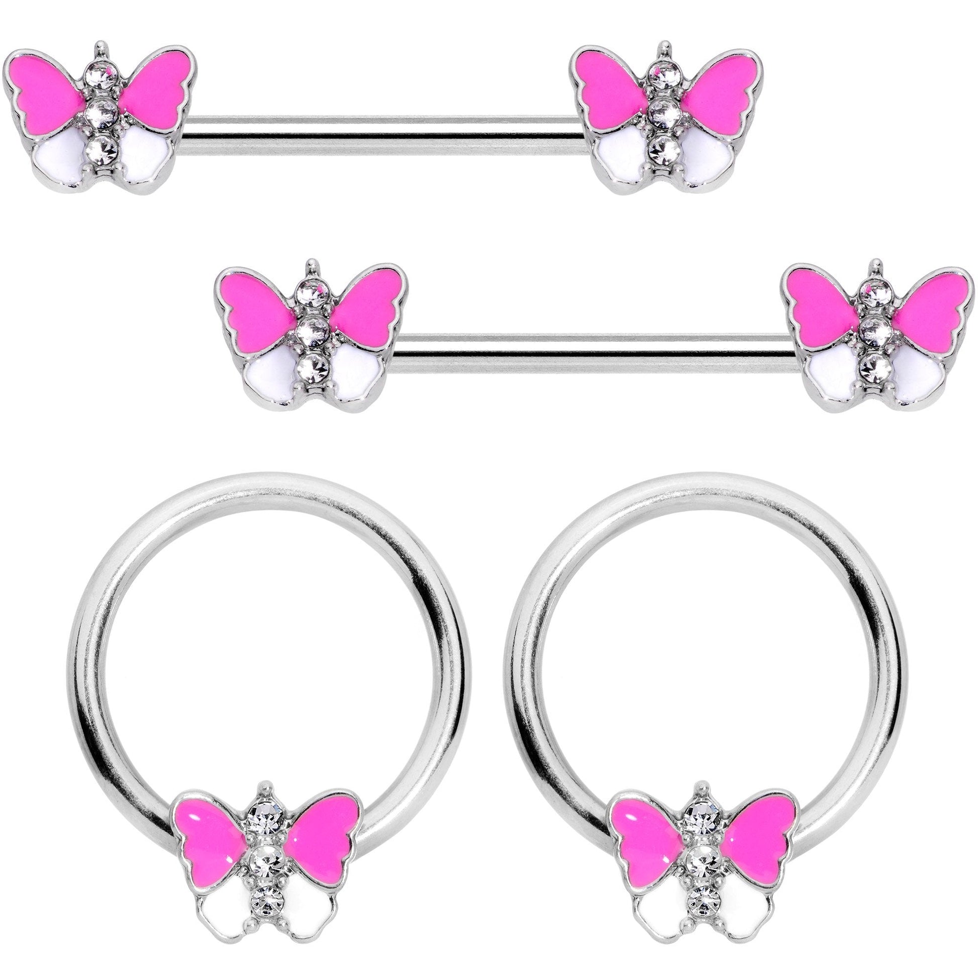 These pretty color inlaid butterflies have come to add a delicately feminine look to your nipple piercings with their pink and white wings! First, there's a set of 14 gauge, 12mm captive bead rings made with durable 316L surgical grade stainless steel circular rings. These have the lovely little butterflies as the closure instead of the standard plain bead. You also get a pair of 14 gauge, 14mm durable 316L surgical grade stainless steel straight barbells. The butterflies have landed on these as well, replacing the ball ends with their pretty colors for a sweetly charming appearance that makes one think of a sunny Spring day. Spread your wings and let your look fly into a fashion-forward look with this set of butterfly nipple piercings! Sold as a set of four.Specifications