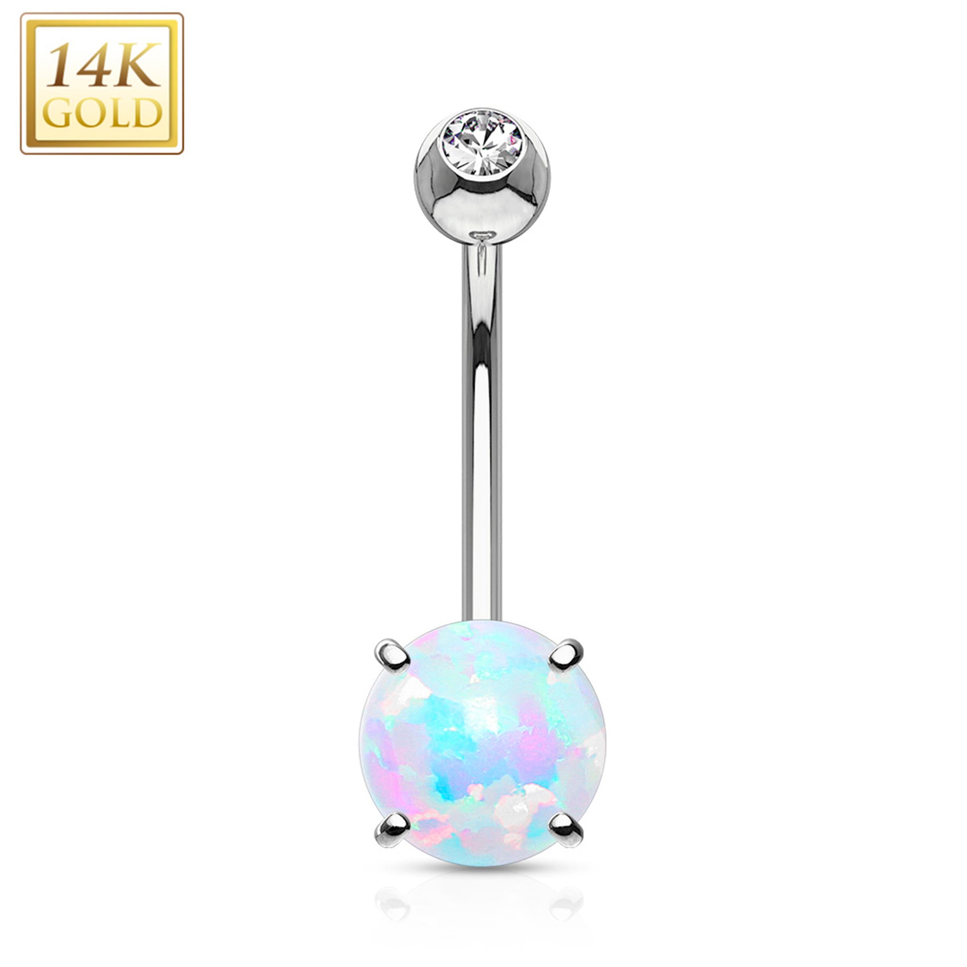 14k Solid White Gold Regal CZ 6mm Synthetic Opal Belly Ring