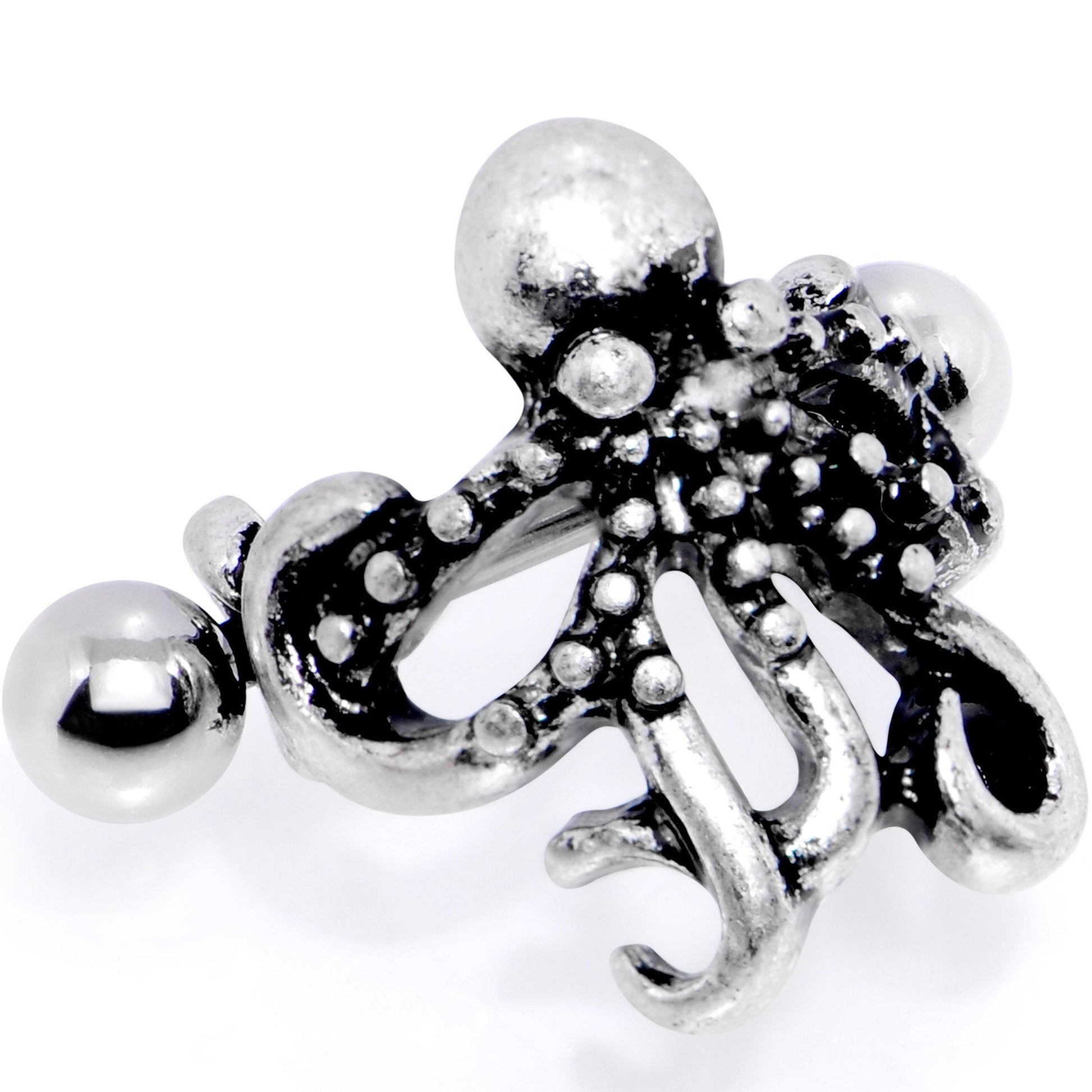 If you love everything nautical then you will love this 16 gauge helix cuff featuring a creature from the sea. Made with a 12mm durable 316L surgical grade stainless steel straight barbell, this helix cuff jewelry features an outstretched octopus bottom charm straight from the sea. This fancy design wraps around your ear cartilage for a unique display.
