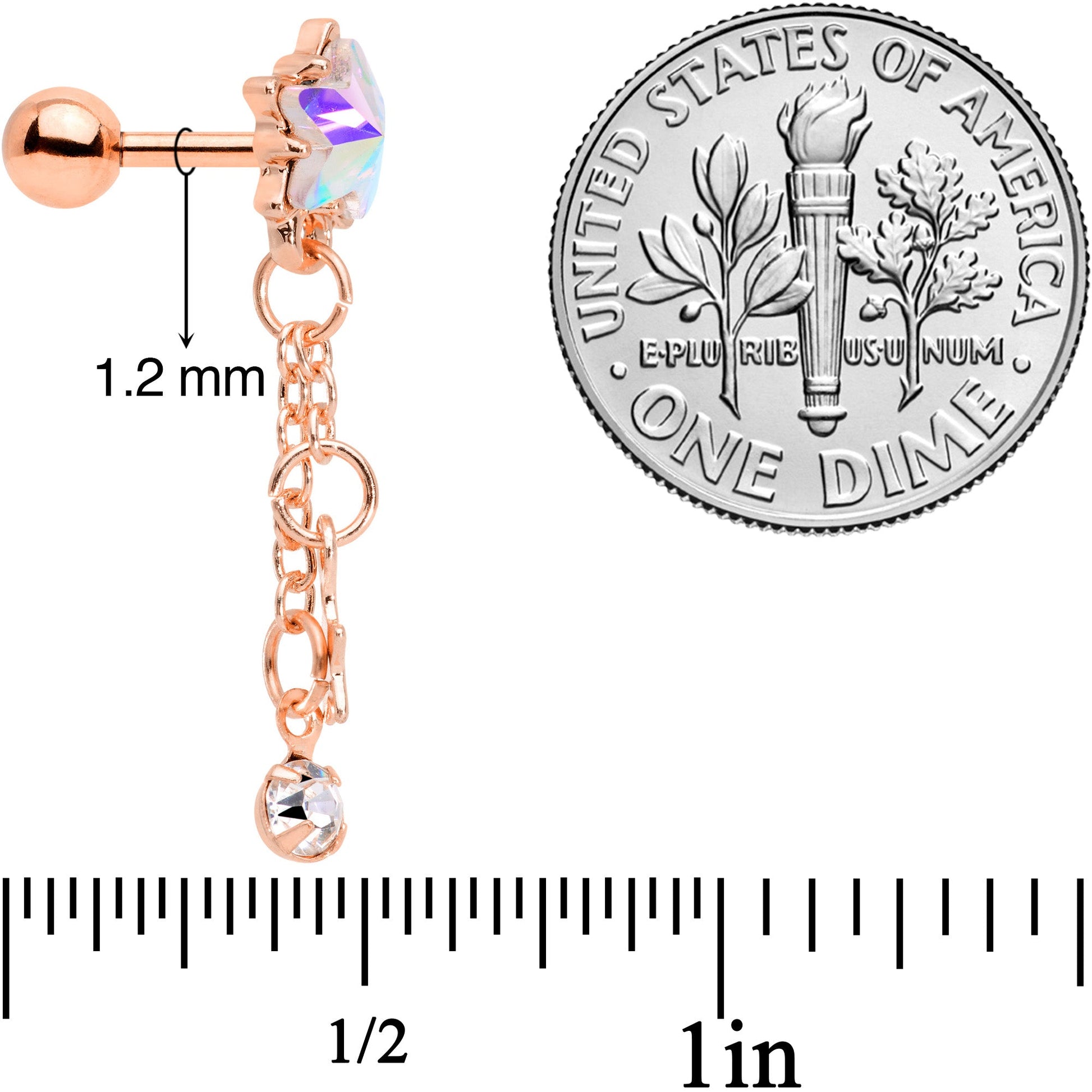 No need to try and catch a star anymore! Now we've caught them and the hardest part will be deciding which piercing to wear it in! This 16 gauge cartilage stud is made with a 6mm rose gold tone plated over 316L surgical grade stainless steel straight barbell with a 4mm ball end. It features a star-shaped aurora gem charm with two small dangle chains with a star charm and a small clear gem. These will move with your body, drawing eyes with their graceful swaying. And this tragus stud works well in multiple piercings including the helix, tragus, and other cartilage piercings. Give your piercings a starring role!Specifications