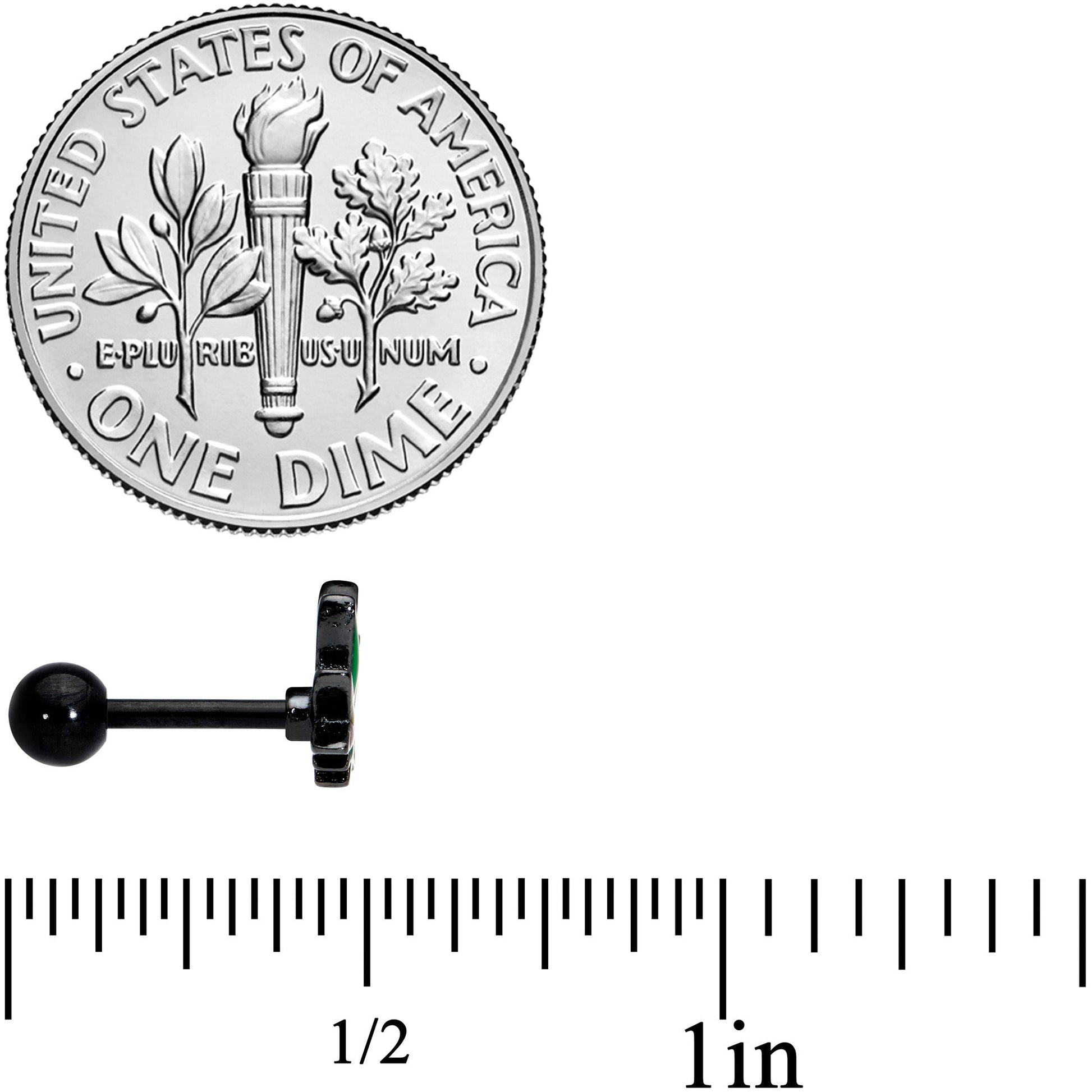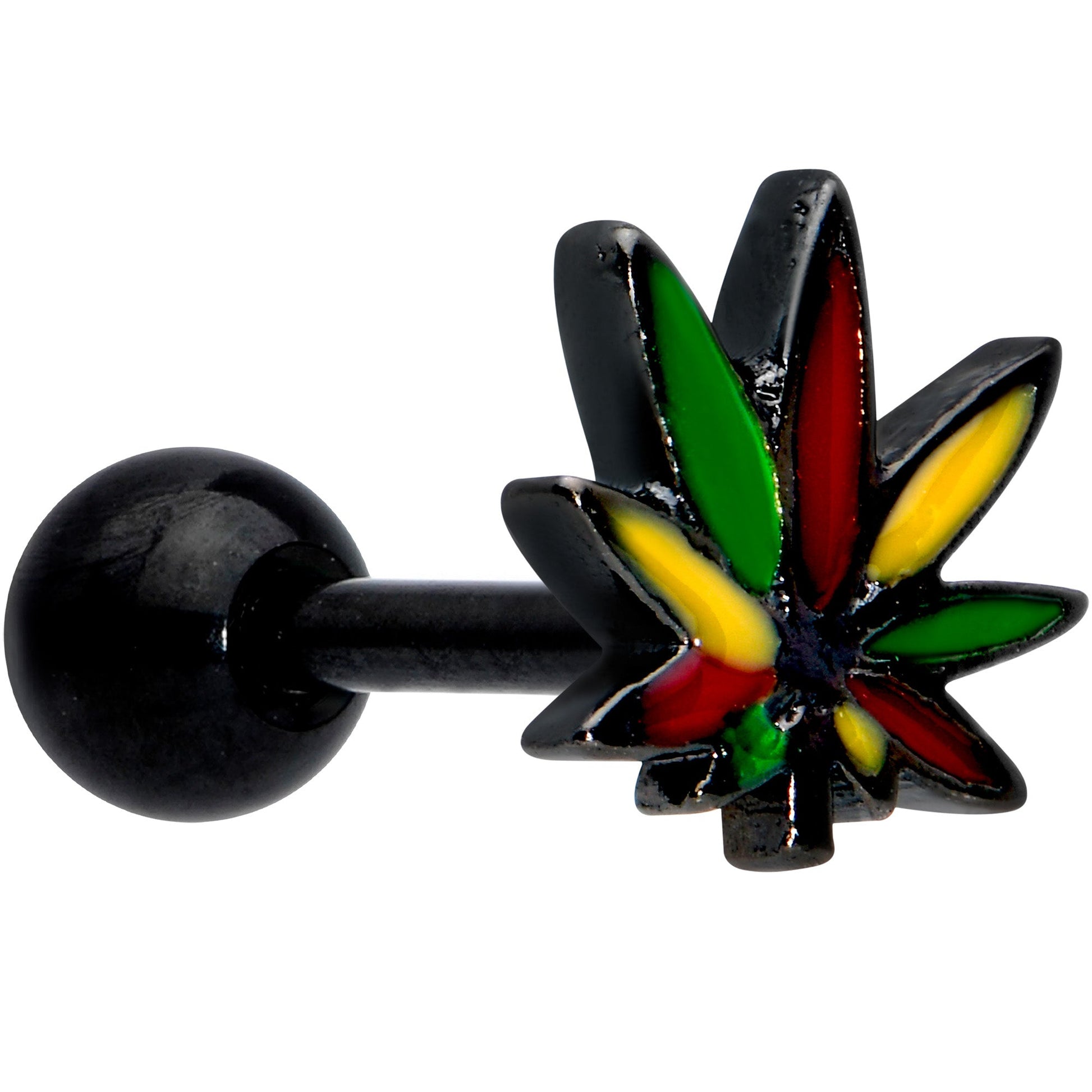 Grab your bong - it's always 420 somewhere when you're rocking this 16 gauge tragus stud! It's made with a 6mm black PVD over 316L surgical grade stainless steel straight barbell with a 4mm ball end. It features a pot leaf charm. The pot leaf is embellished with each leaf set in a different color for a wild and stylish effect. And you can rock this ring in multiple piercings including tragus, helix, and some conch piercings. Perfect for polished potheads and snazzy stoners, you'll love this cartilage stud so much you'll almost catch a buzz!Specifications