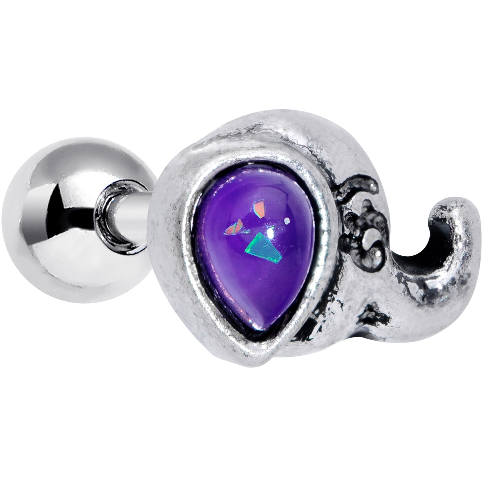 The elephant on this 16 gauge cartilage stud has some serious style! It's made with a 6mm durable 316L surgical grade stainless steel straight barbell with a 4mm ball end. It features an elephant's head charm, with simple detailing for an elegant look. To add a pop of color, its ear is composed of a drop shaped blue faux opal for a very on-trend appearance. And you wear this beauty in multiple piercings including helix, tragus, and some conch piercings. Add a touch of wonderful wildlife to your look with this elegant elephant tragus stud!Specifications