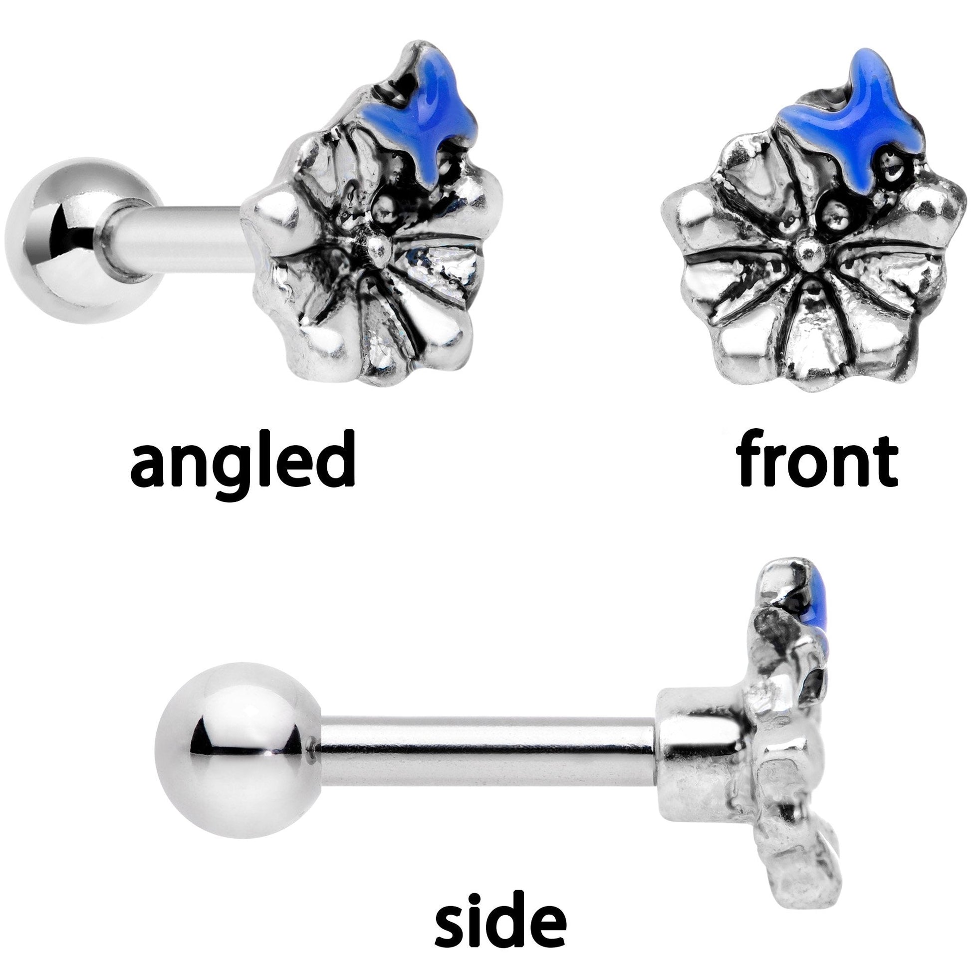 If you're all about the outdoors then you will love this set of 16 gauge tragus piercings. Made with 6mm durable 316L surgical grade stainless steel straight barbells, these cartilage earrings feature a plain ball end, a flower with butterfly end, and blue gem end to be worn in a variety of cartilage piercings. Sold as a set of three.Specifications
